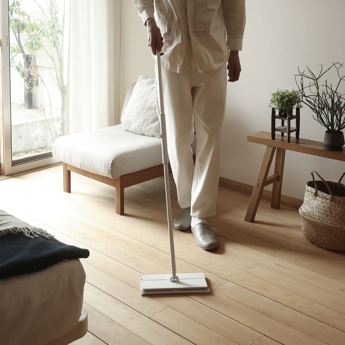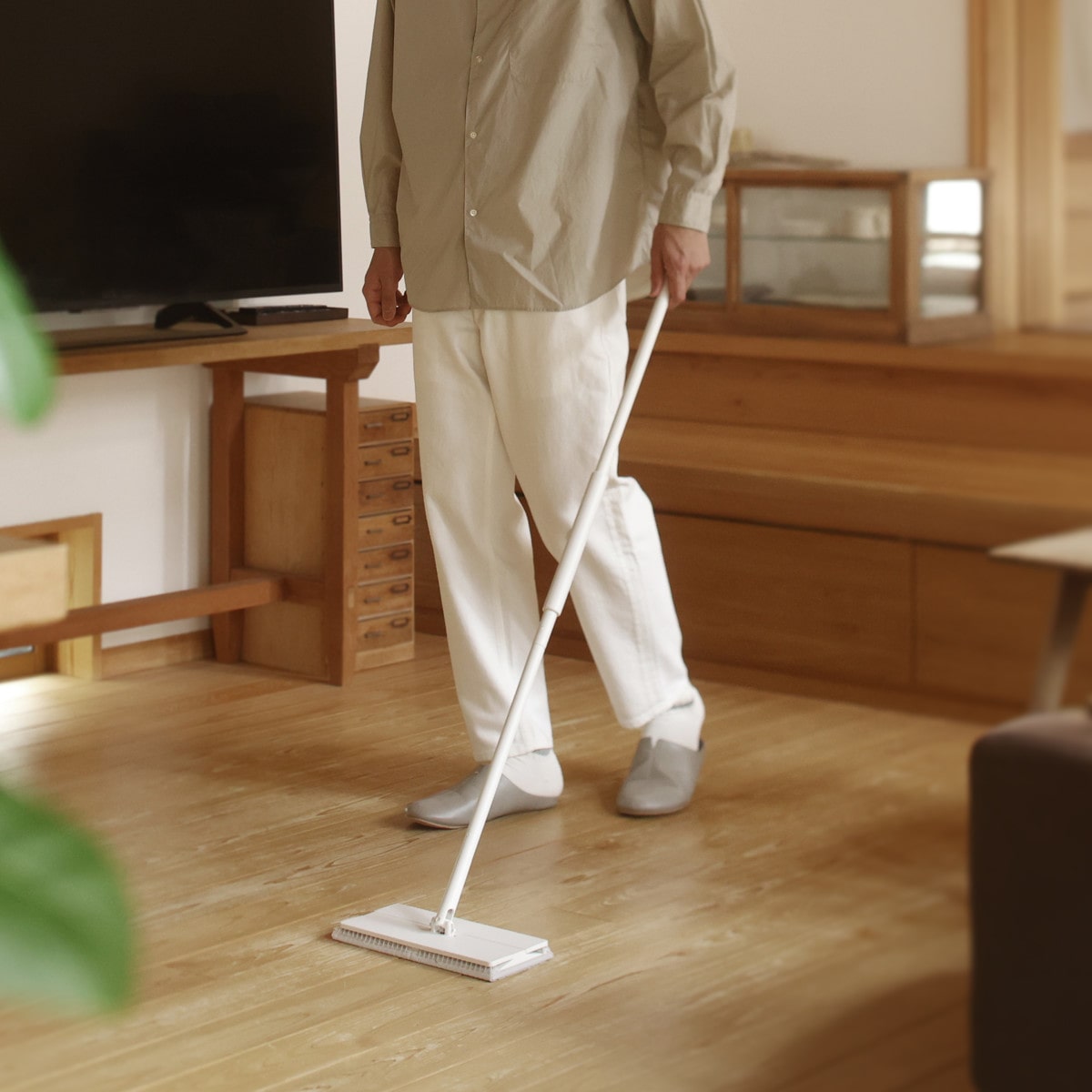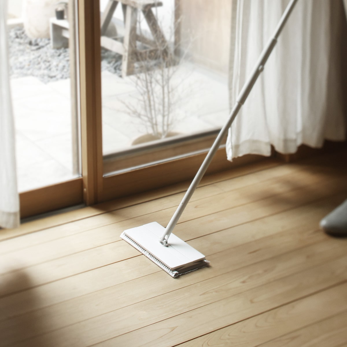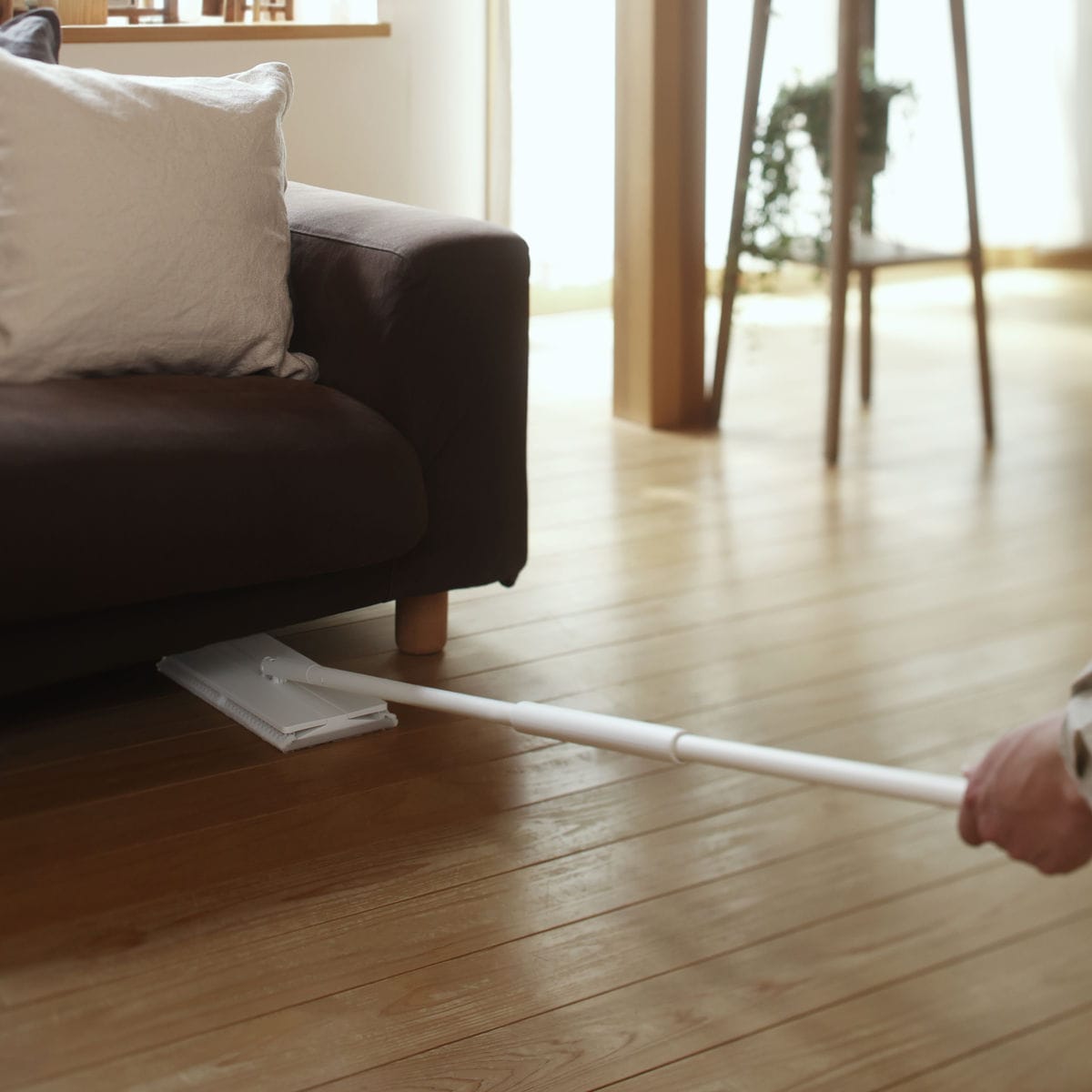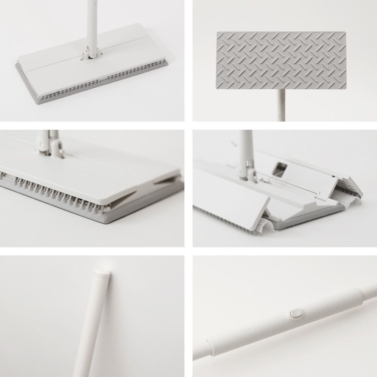 ヘッドに直接触れずにシートの付け外しができるフローリングワイパーです。ポールにあるボタンを押しながらスライダーを下げることでヘッドが開くので立ったままでも簡単に操作できます。
