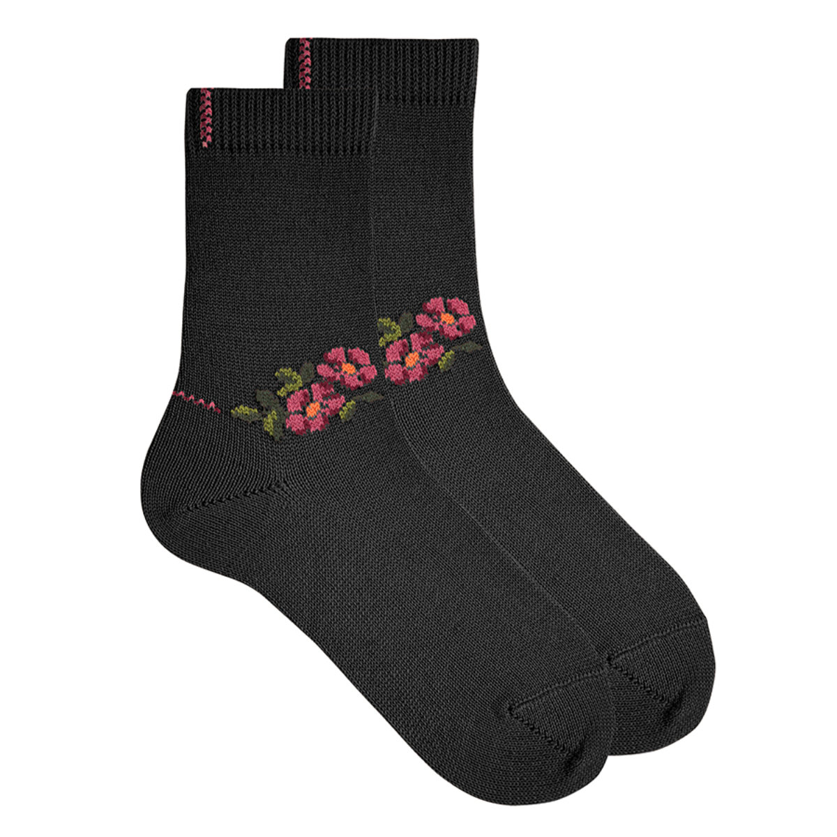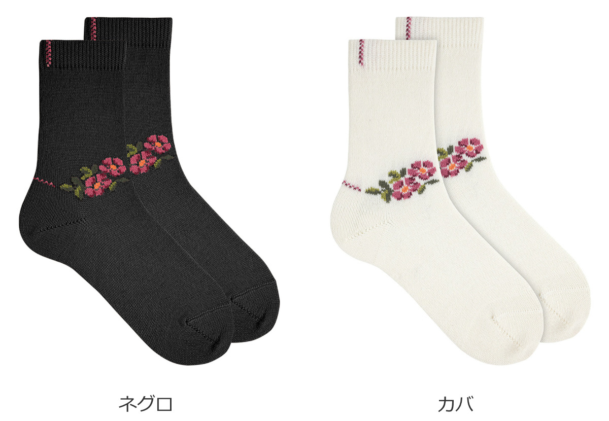 ■正面にはお花の柄、履き口とかかと部分にはピンクのラインが入っています。