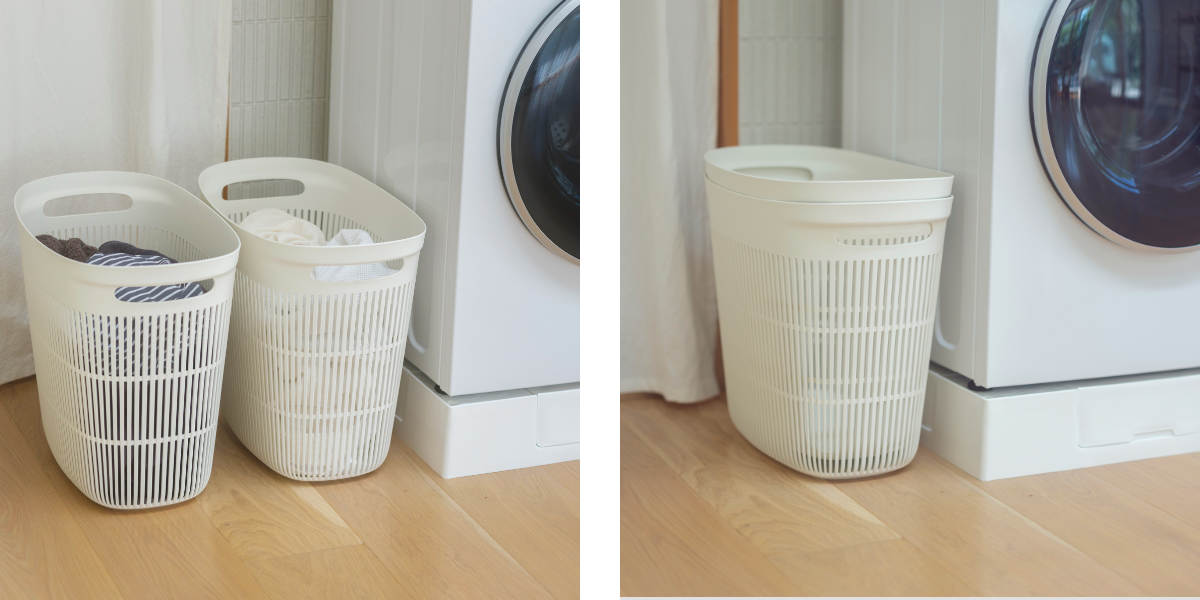 スリムなので、使い分け用にバスケットを2つ並べて置いてもスッキリ。スタッキングできるので、使っていないときはコンパクトに収納できます。