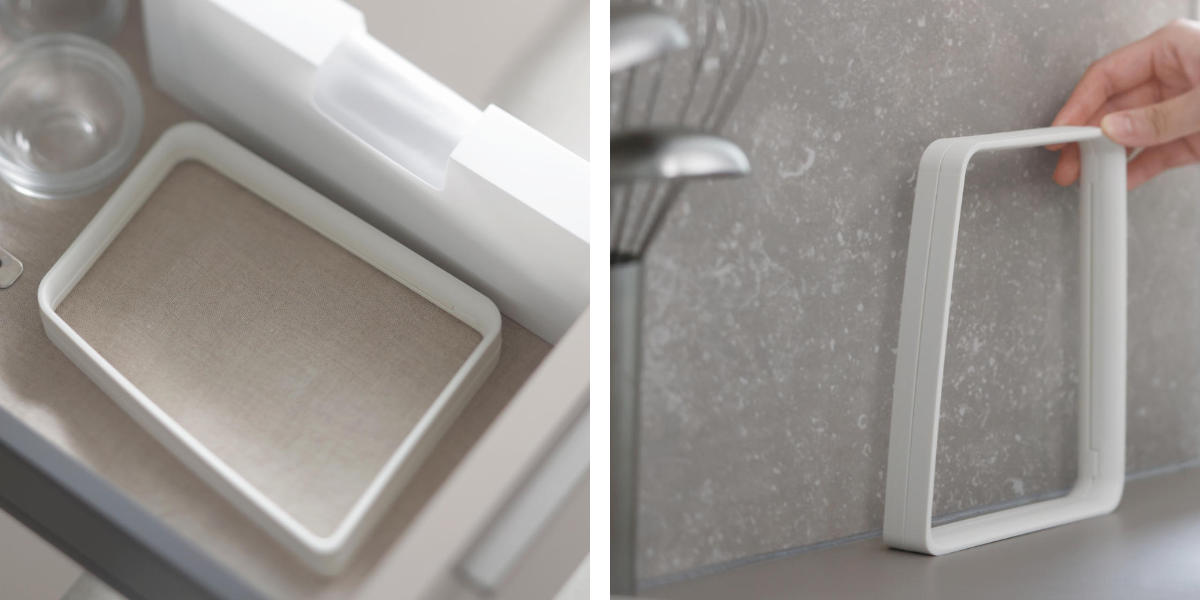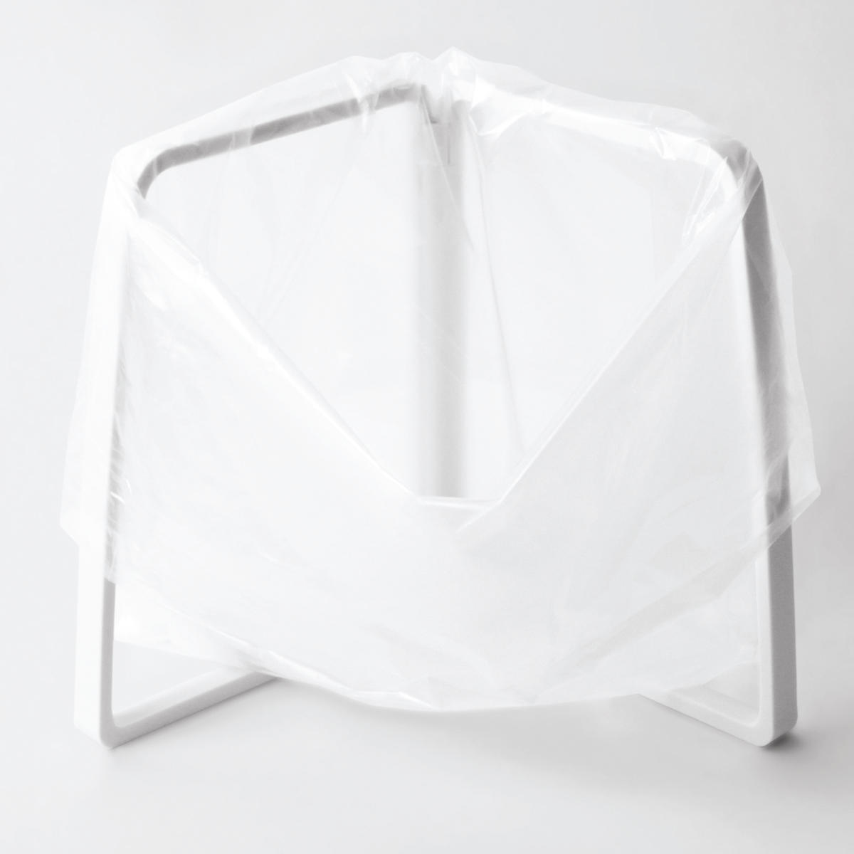開いたフレームの間にポリ袋を入れて、奥から手前の順にかけるだけ。使い終わった後の取り外しもスムーズです。