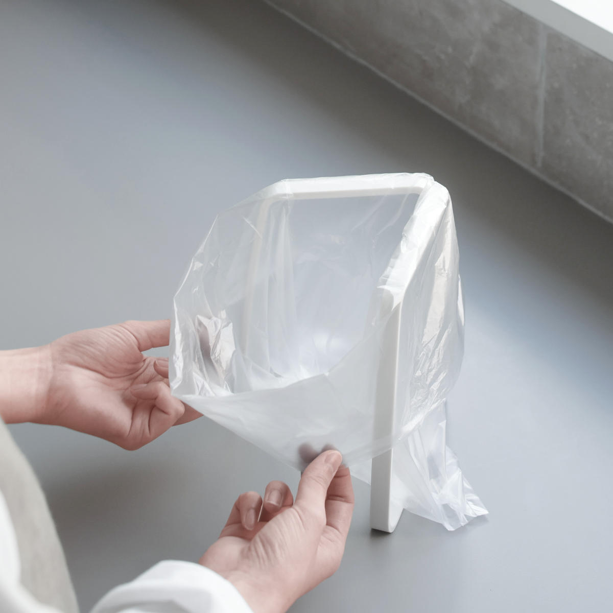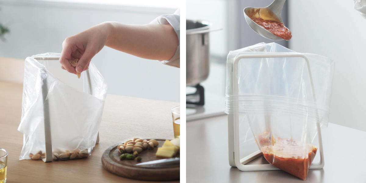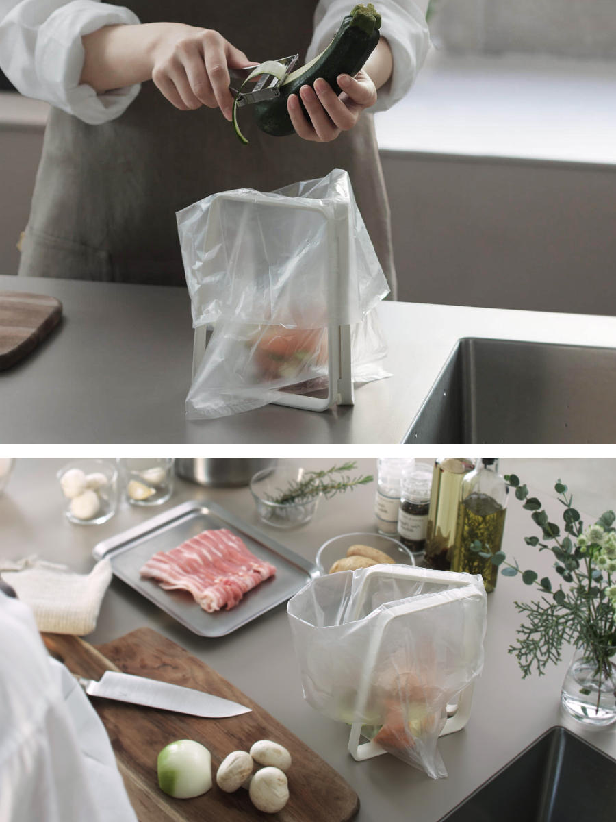 調理中に出る生ゴミをサッと捨てられるV字型の自立式ポリ袋ホルダーです。袋の口がしっかり開くので、両手がふさがっていてもスムーズに捨てられます。フレームの開きを調整することで、狭いスペースでもかさ張らずに使えます。