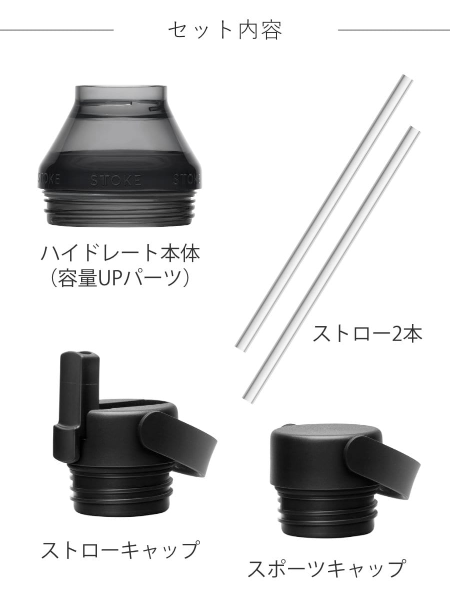 | 内容量 | 【セット内容】 ハイドレート本体(容量UPパーツ) スポーツキャップ ストローキャップ ストロー2本 |