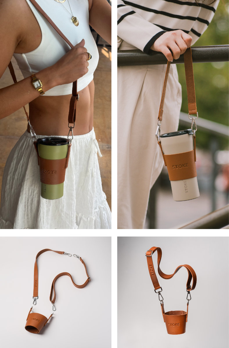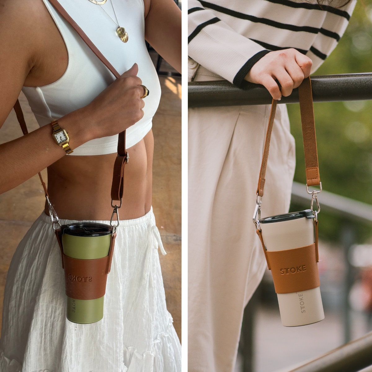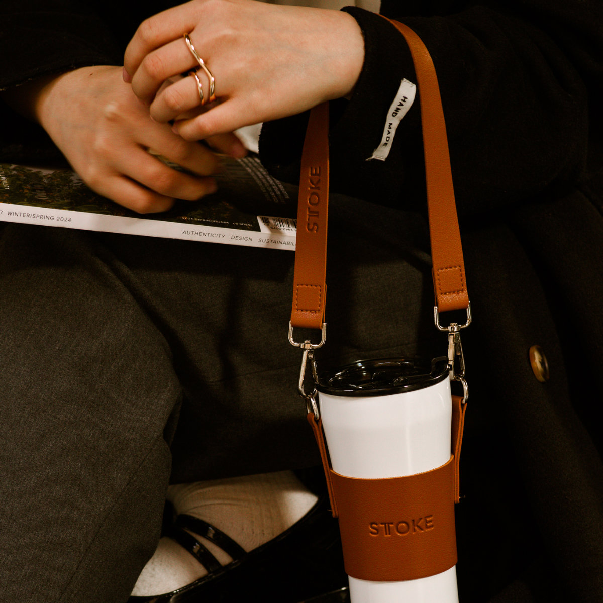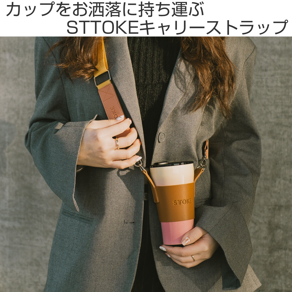手ぶらで持ち歩けるSTTOKEのキャリーストラップV4です。タンブラーをストラップで斜め掛けや肩掛けにできるため、両手が自由になり、通勤・散歩・カフェなどで重宝します。
