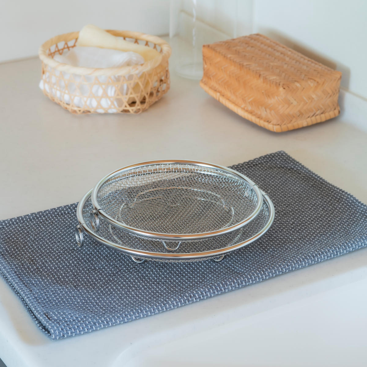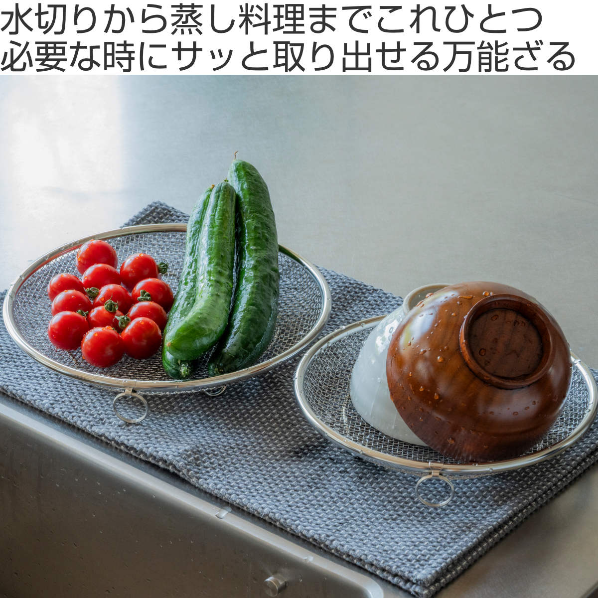 必要な時だけサッと取り出して使える脚付きの盆ざるです。鍋やフライパンにすっきり収まるデザインなので、食器の水切りから麺料理、揚げ物、お鍋の具材、蒸し料理まで幅広くお使いいただけます。