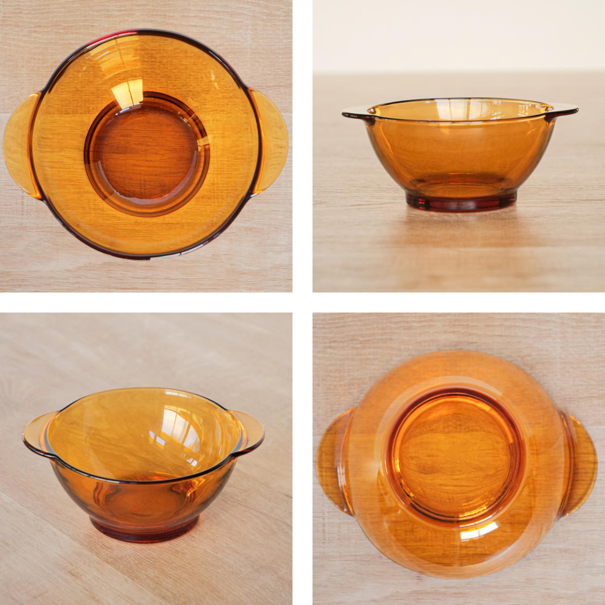 表面はつるつると滑らかな質感です。熱いお料理を入れた時に便利な持ち手付きです。程よい厚みと重さで安定感があり、手に沿うフォルムでしっくりと馴染みます。底面には「DURALEX」の刻印入りです。
