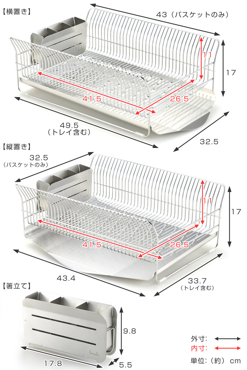 | サイズ | 【横置き】 約幅49.5×奥行32.5×高さ17cm(トレイ含む) 約幅43×奥行32.5×高さ17cm(バスケットのみ) 内寸:約幅41.5×奥行26.5×高さ11cm 【縦置き】 約幅43.4×奥行33.7×高さ17cm(トレイ含む) 約幅43.4×奥行32.5×高さ17cm(バスケットのみ) 内寸:約幅41.5×奥行26.5×高さ11cm |
