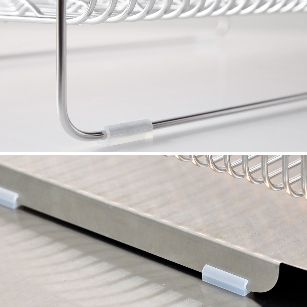 ラック本体には滑り止め、水受けトレーにはクッションゴムが付いています。水周りでも滑りにくく、設置面に傷が付きにくいです。