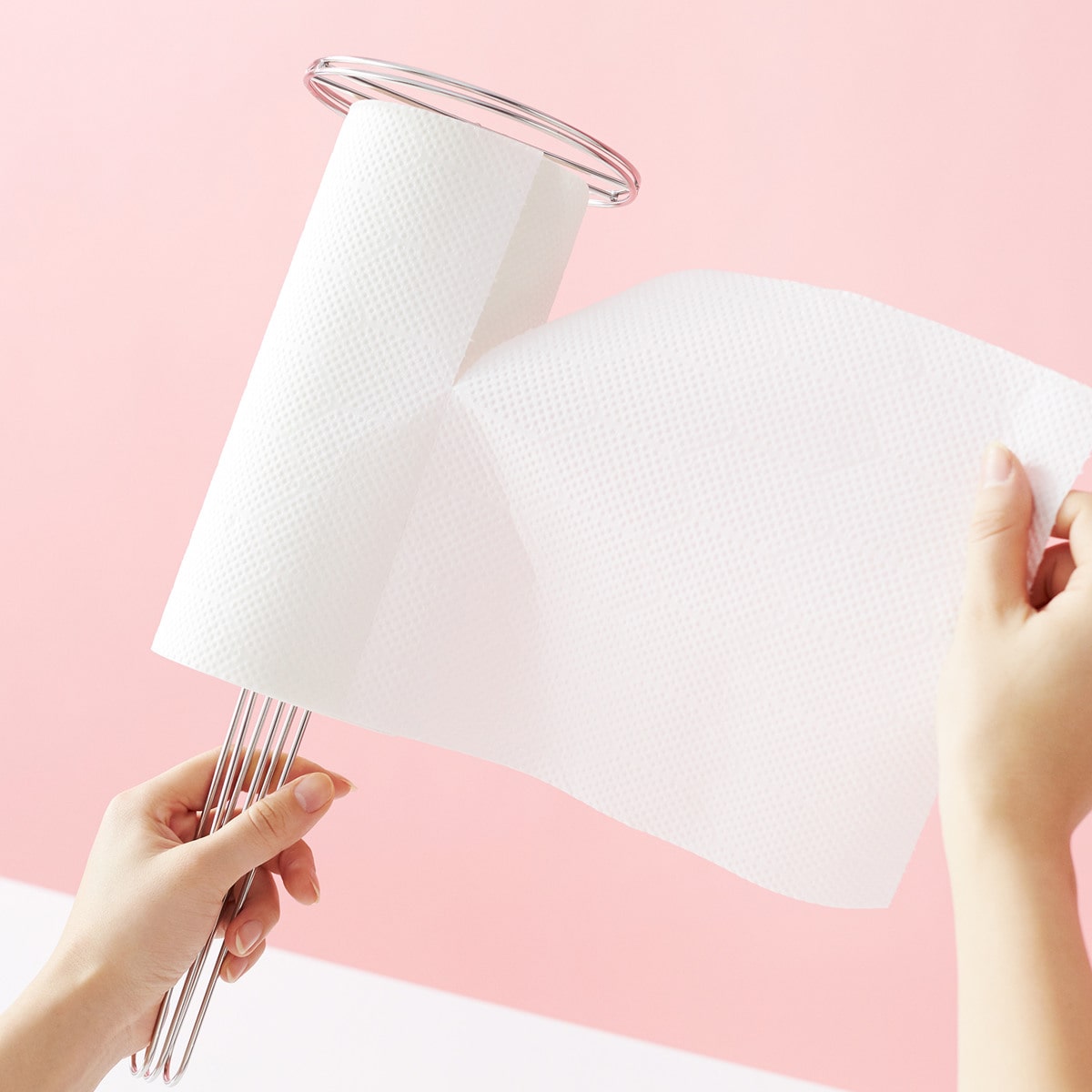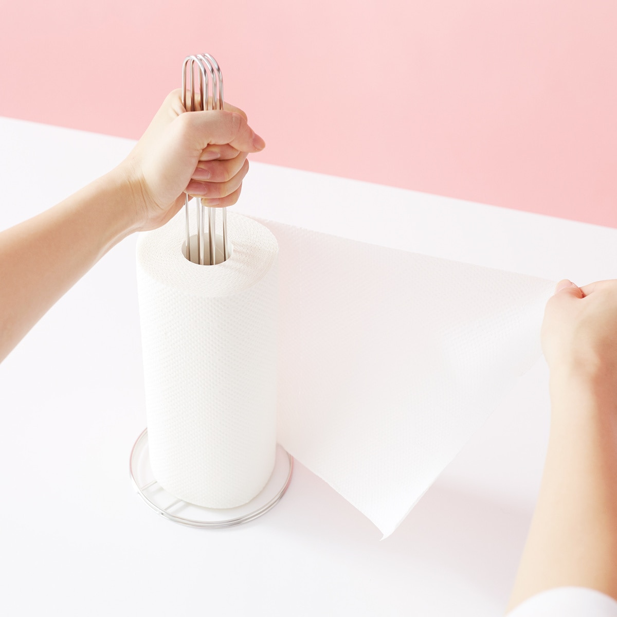 持ち手のワイヤーを握ることでスムーズにペーパーを引き出せて、握る手を緩めると止まる仕組み。ペーパーを直接押さえる必要がないので、汚さず衛生的に使えます。