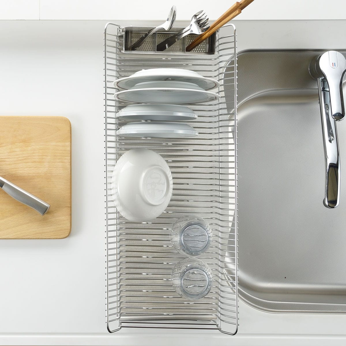 幅約24.5cmのスリムサイズで、シンクまわりの限られたスペースにもすっきり収まります。普段は食洗機を使う方も、サブの水切りラックとして気軽に活用可能。縦長タイプなので、シンクの上をまたいで設置することもできます。