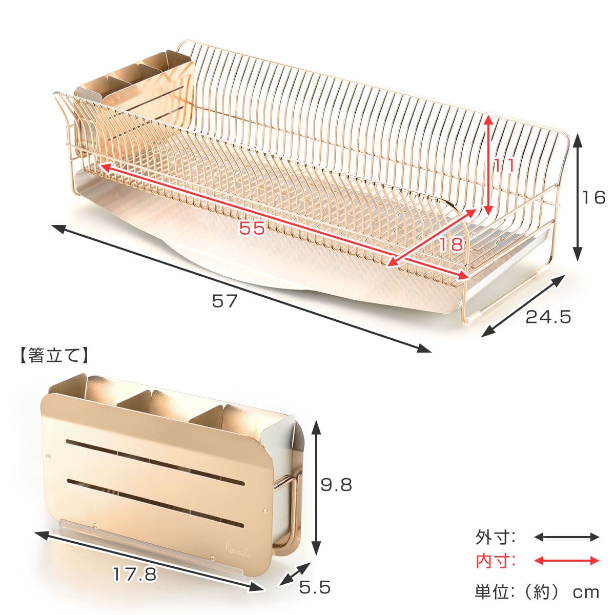 | 材質 | 本体・箸立て:18-8ステンレス(ローズゴールドメッキ) トレイ・仕切り板:18-8ステンレス 滑り止め・クッションゴム:シリコーンゴム |