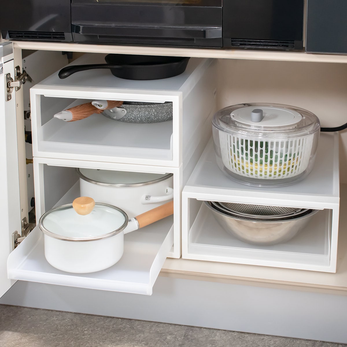 スタッキング時の耐荷重は約30kgです。鍋やフライパンなど、シンク下の整理、キッチン収納にぴったりです。丈夫なポリプロピレン製で、汚れても水拭きできて衛生的です。スタッキングすると、1段につき高さが約6mm縮みます。
