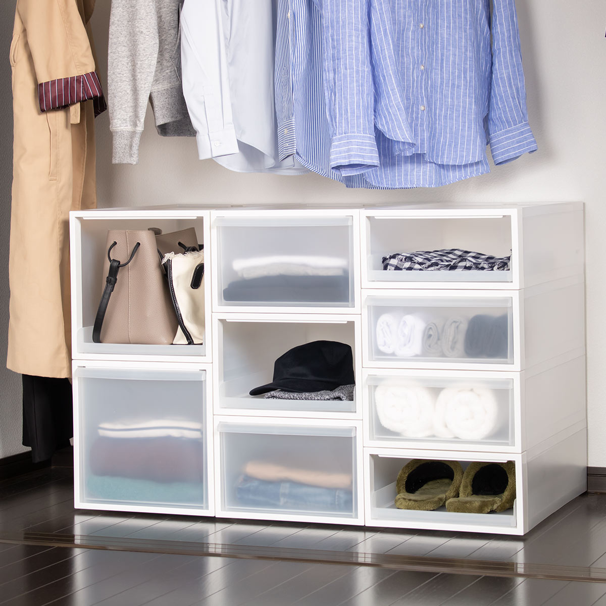 前面オープンで収納物がひと目でわかるので、迷わず出し入れできます。クローゼットに収まる奥行約50.5cmです。押入れやクローゼット収納としてもおすすめです。