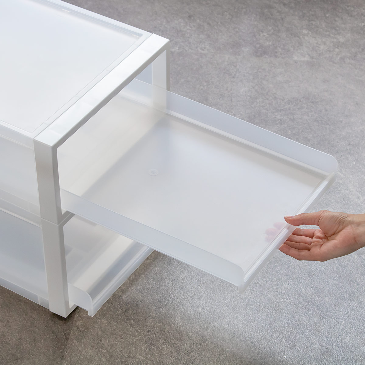 同シリーズの引き出しタイプと、スタッキング可能です。引き出しとトレーを組み合わて自分仕様にカスタマイズを楽しめます。