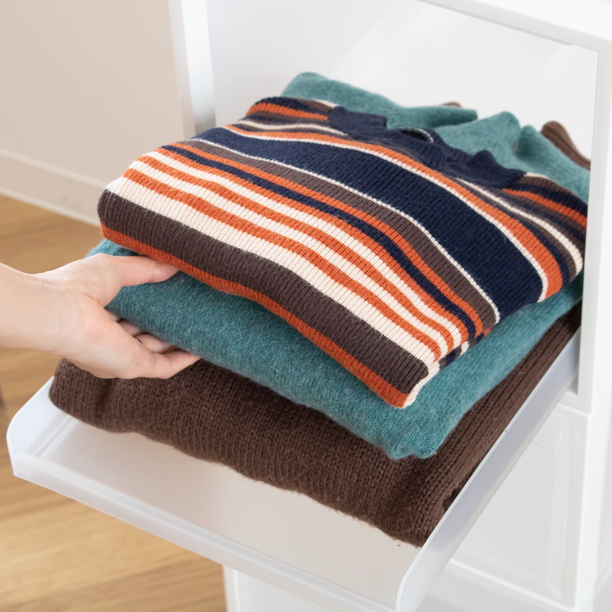 トレーのサイズは、ニットやシャツをたたんだ時のサイズと同じくらいの幅に設定しています。トレーの中に無駄な余白を作らず、引き出した衝撃で収納物が崩れるのを防ぎます。