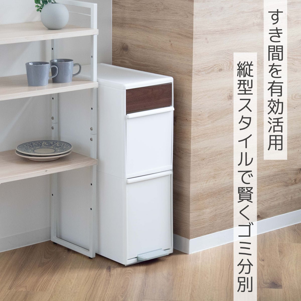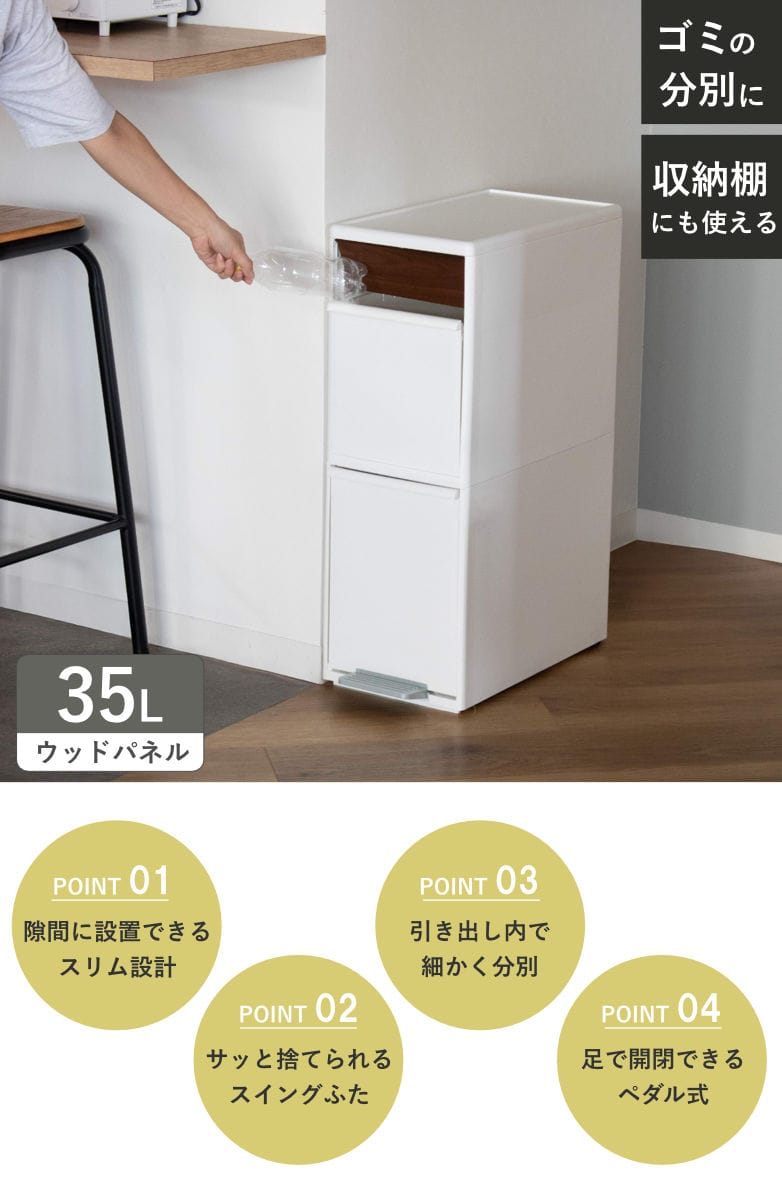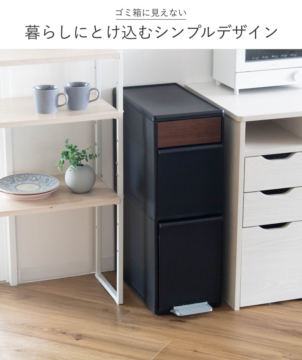 上段にはプッシュすれば、片手でサッとゴミを捨てられるスイング式のふたがついています。ふた部分にはおしゃれな木目調パネルを使用しており、インテリアに自然になじみます。