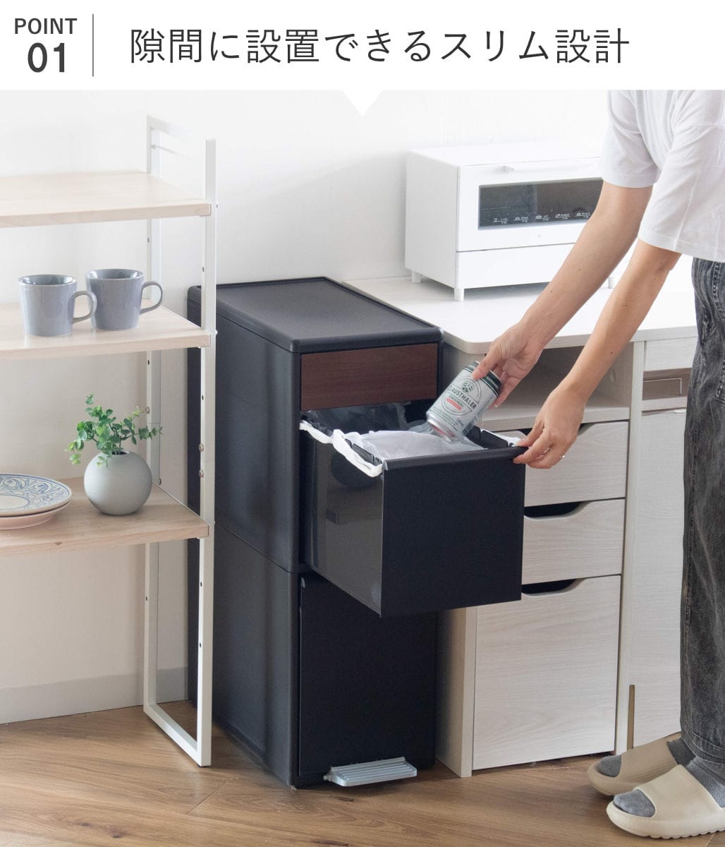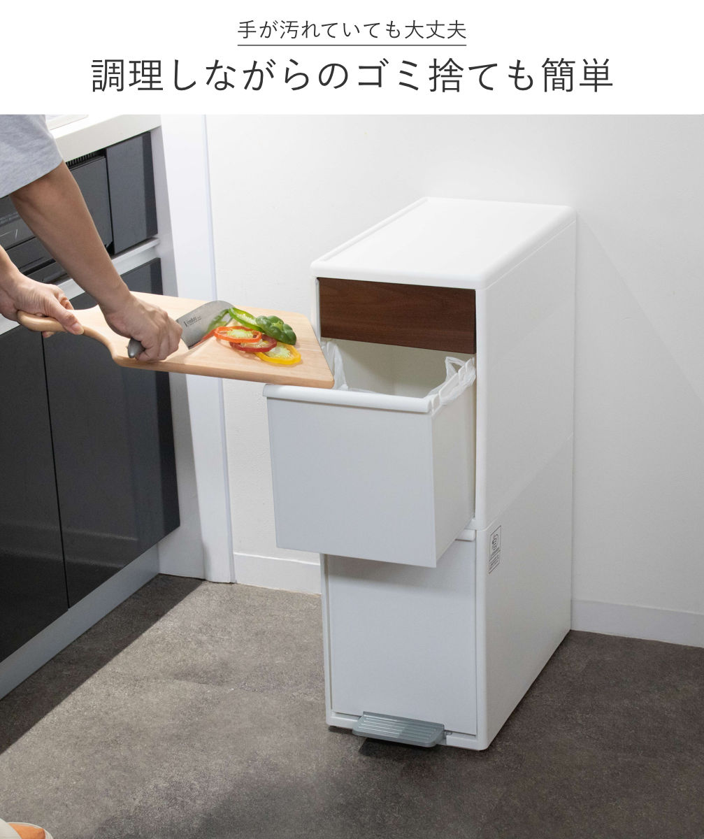 キッチンの空間を有効に使える、幅約25.5cmのスリムなゴミ箱です。冷蔵庫・シンク・食器棚横などのキッチンのデッドスペースに設置できて、ペットボトル・缶などのかさばる資源ゴミもひとまとめにできます。