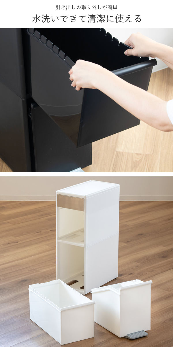 各段の引き出しは取り外しが簡単にできます。汚れが気になった場合は取り外してまるごと水洗いすることも可能です。
