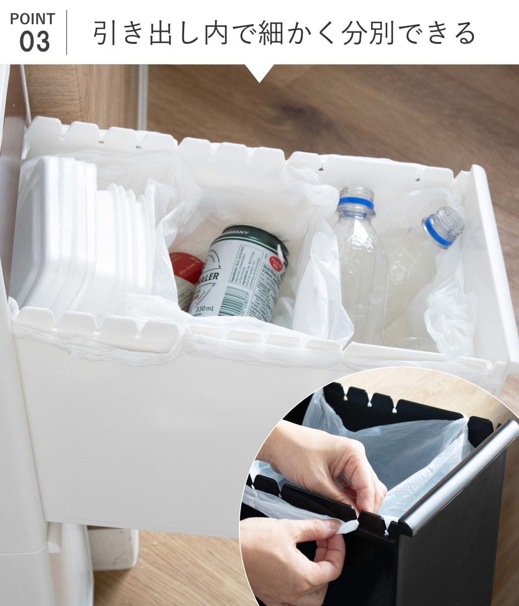 左右に並んだ切り込みフックに掛けるだけで、ポリ袋を簡単に装着できます。引き出しの奥行きを利用して1段で複数の分別が可能です。種類別にゴミ箱を用意しなくても、これ1台ですっきりと収まります。