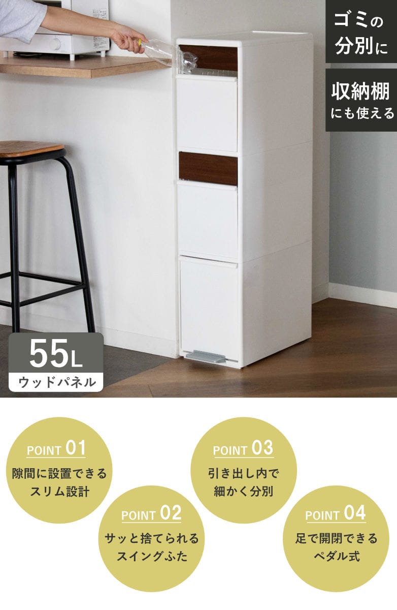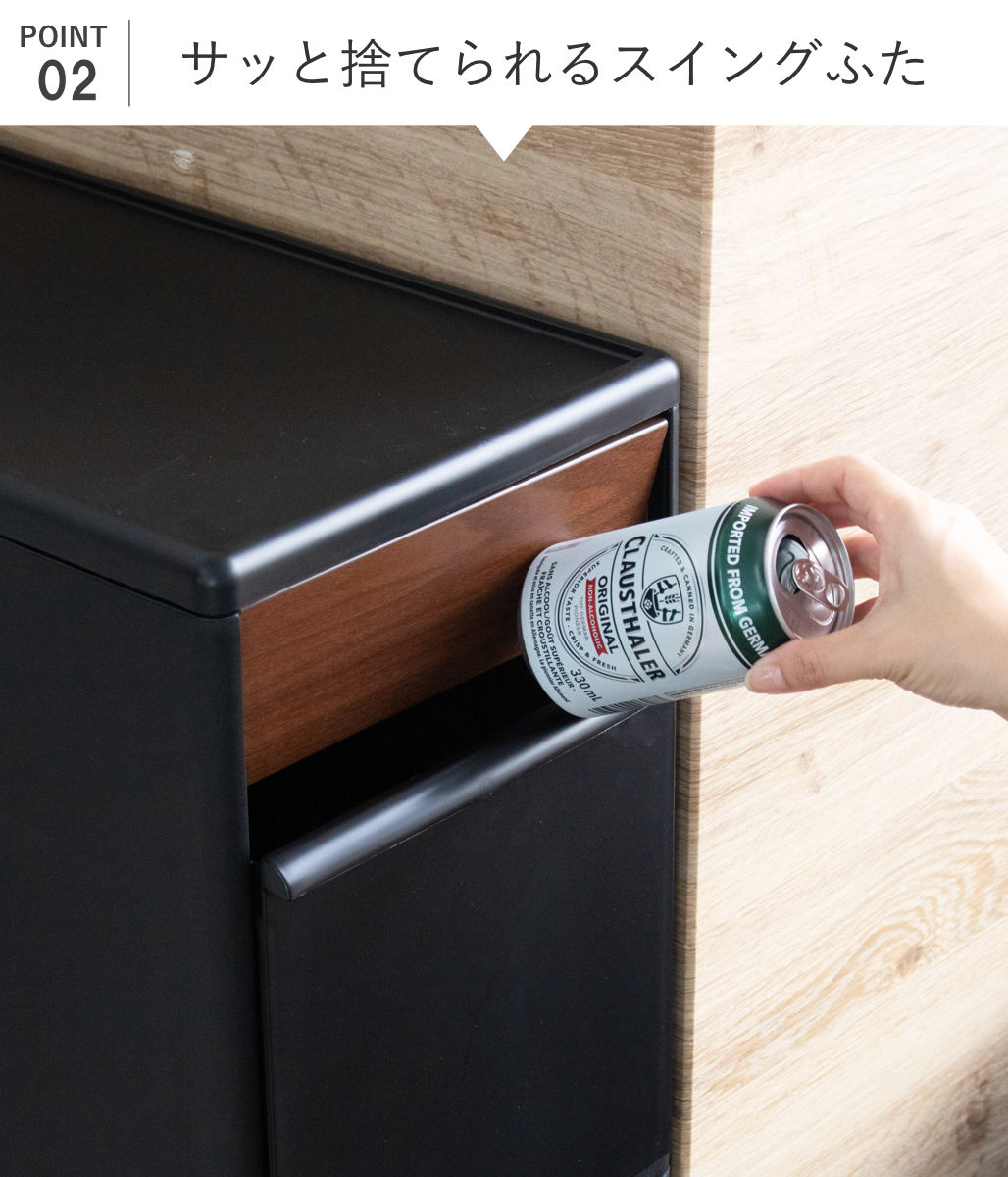 上段にはプッシュすれば、片手でサッとゴミを捨てられるスイング式のふたがついています。ふた部分にはおしゃれな木目調パネルを使用しており、インテリアに自然になじみます。
