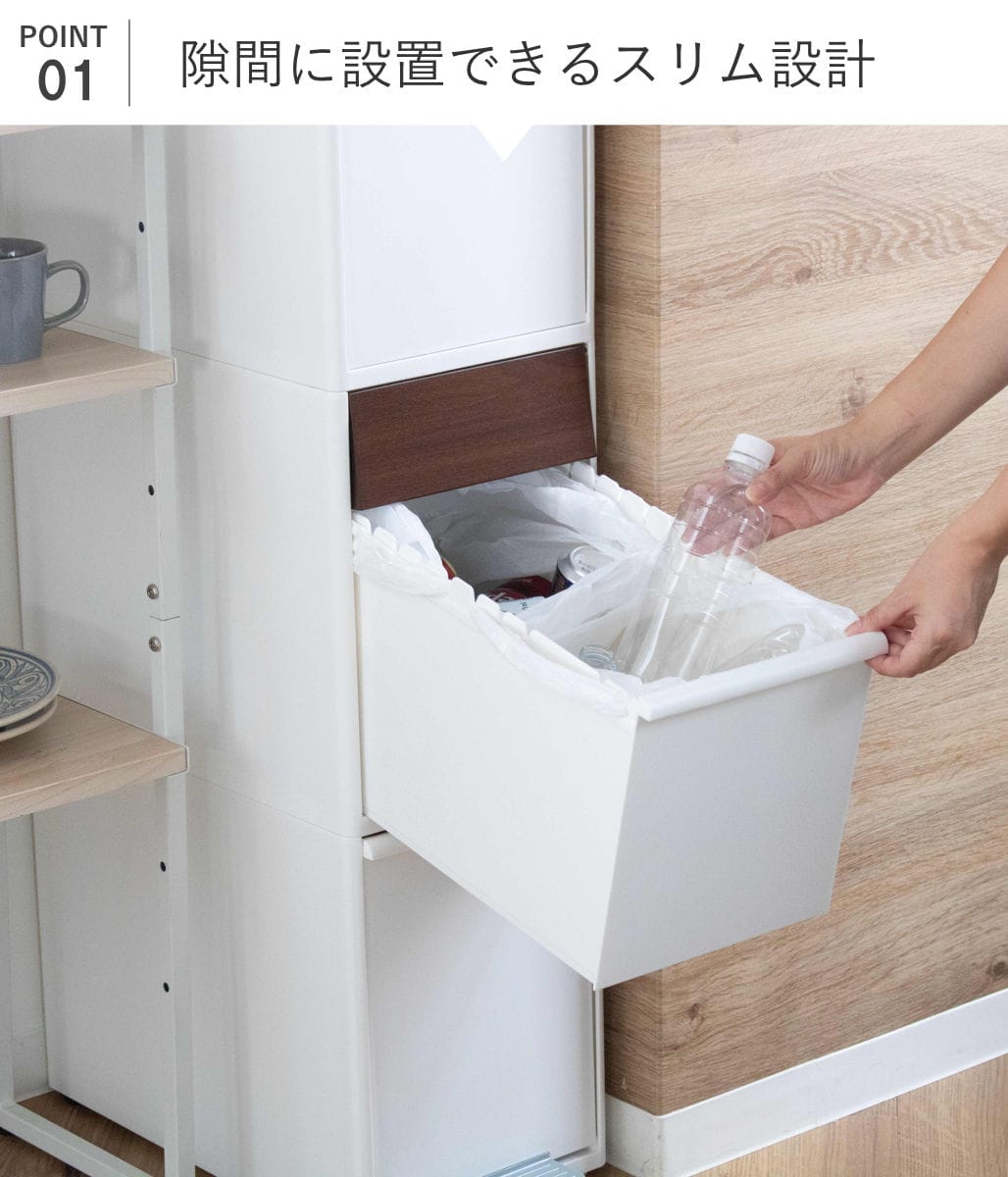 キッチンの空間を有効に使える、幅約25.5cmのスリムなゴミ箱です。冷蔵庫・シンク・食器棚横などのキッチンのデッドスペースに設置できて、ペットボトル・缶などのかさばる資源ゴミもひとまとめにできます。