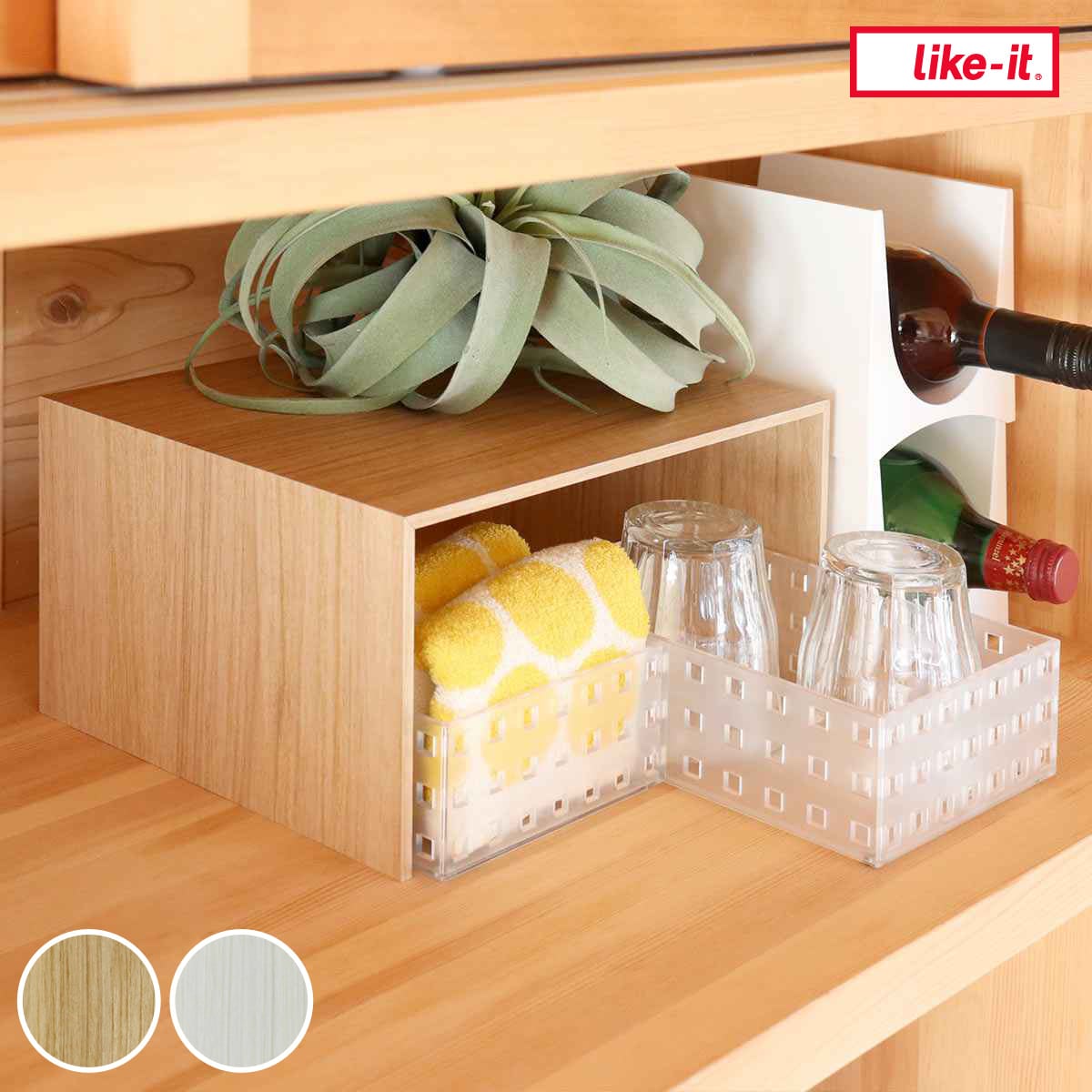 収納スペースを増やしたい場所に置くだけで、手軽に収納力をプラスできるプラスラックです。棚板を1枚増やすような感覚で、簡単に設置可能。食器棚やカップボードなど、「あと少し」収納スペースが欲しいときにおすすめです。