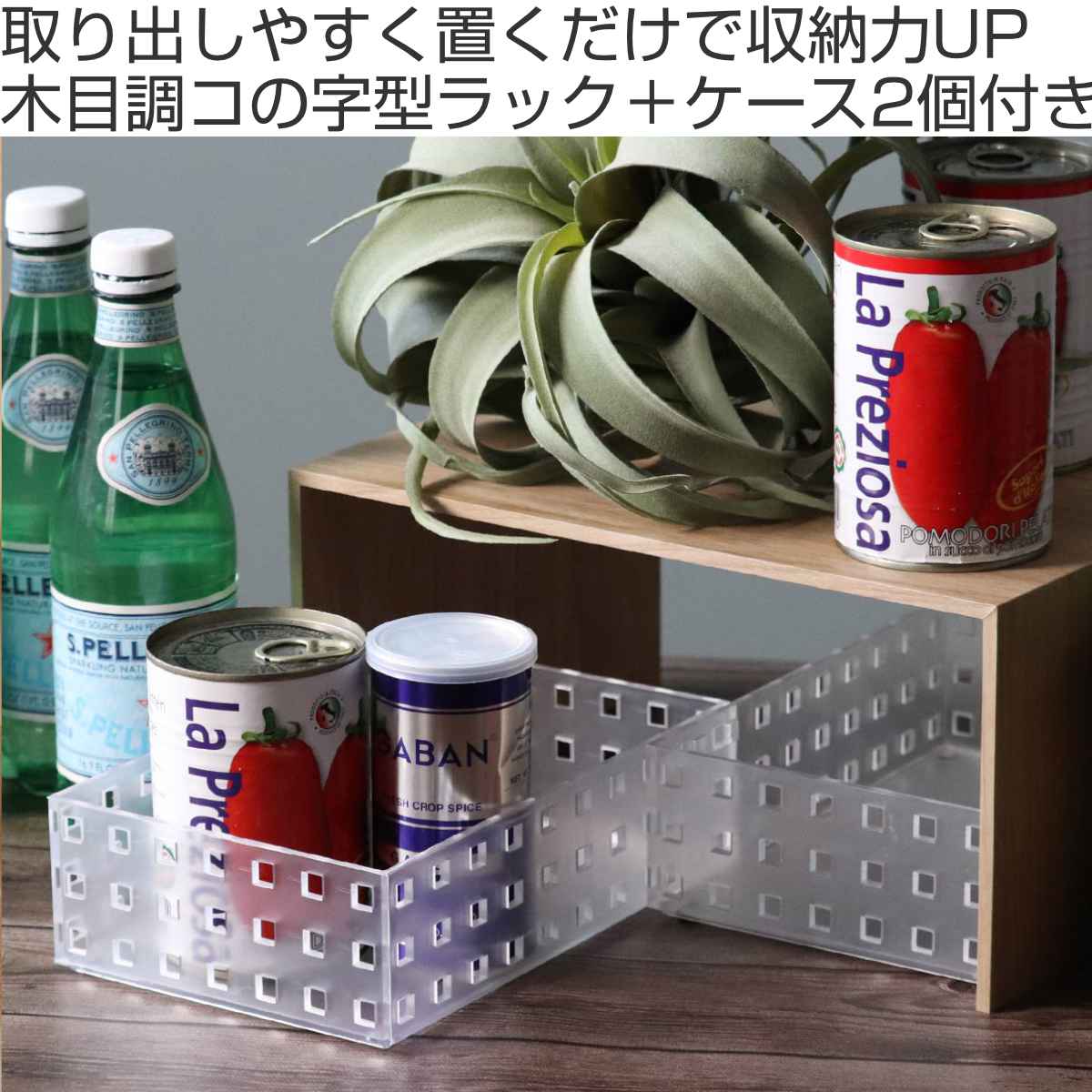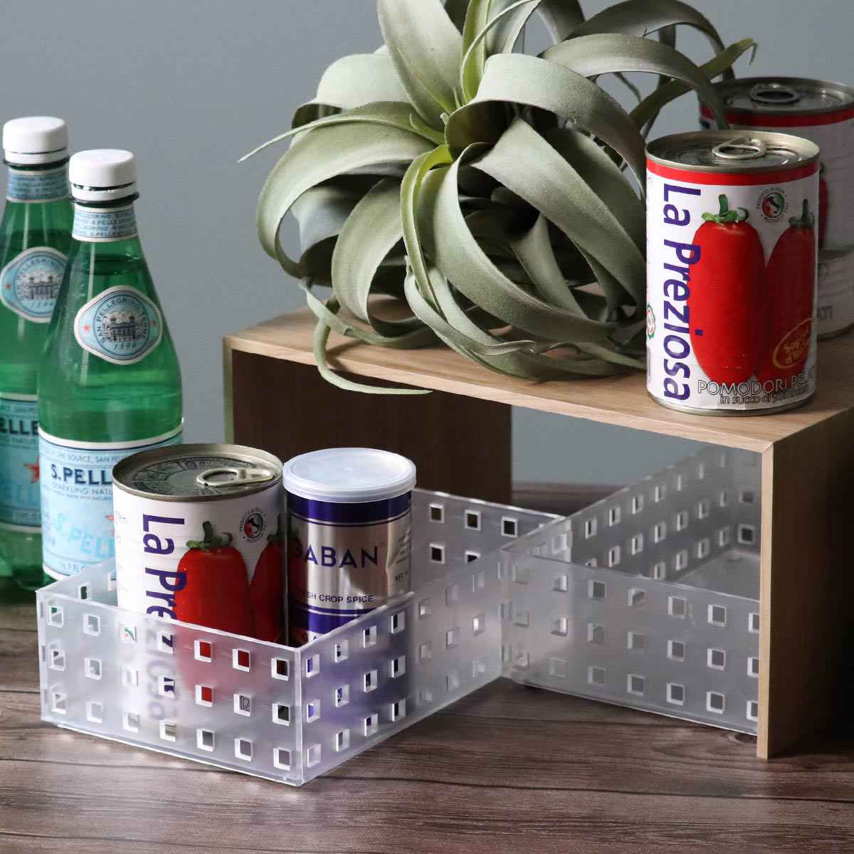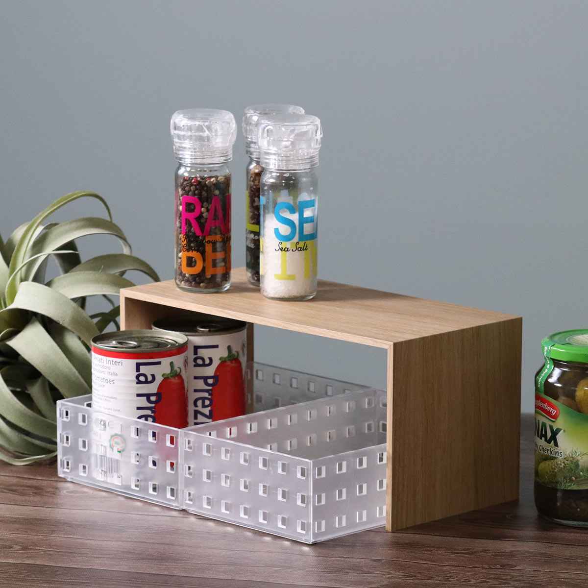キッチン雑貨や種類が増えがちなスパイスや調味料の見せる収納としても。よく使うものは上段や手前に置けばサッと取れて便利です。また、トレーと組み合わせて使うことで、キッチンだけでなくお部屋の様々な場所でお使いいただけます。