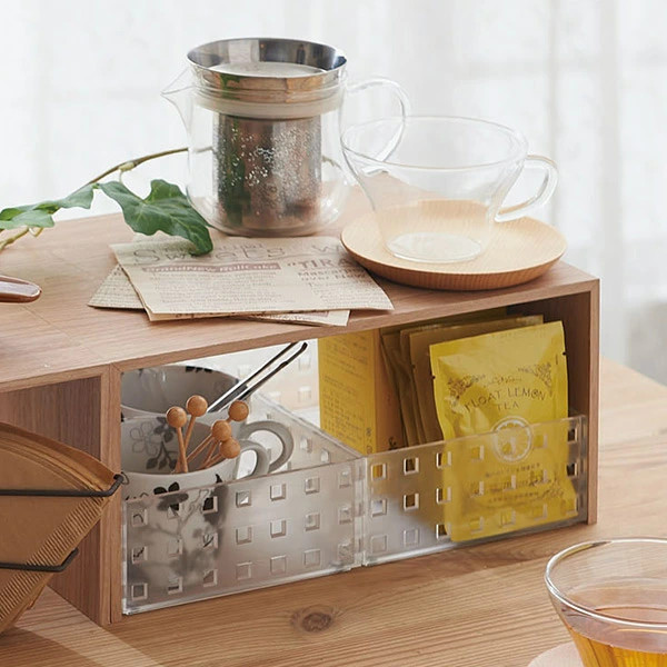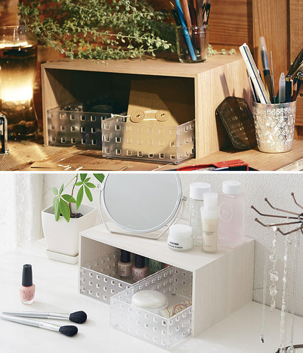 散らかりがちだけど、どこかにしまい込まずにサッと使いたい化粧品や文具などにもおすすめです。どこに置いても様になるインテリア性の高さでオフィス・玄関・洗面所など使い方様々。ケースは半透明なので、お気に入りのアイテムを並べて見せる収納としても。