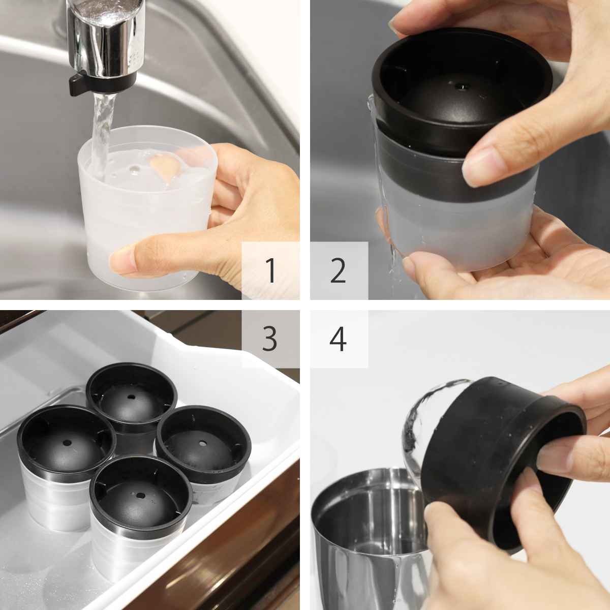 4.容器全体を水で濡らして本体とフタを回して取ったら、フタの真ん中をゆっくり押して氷を取り出す
