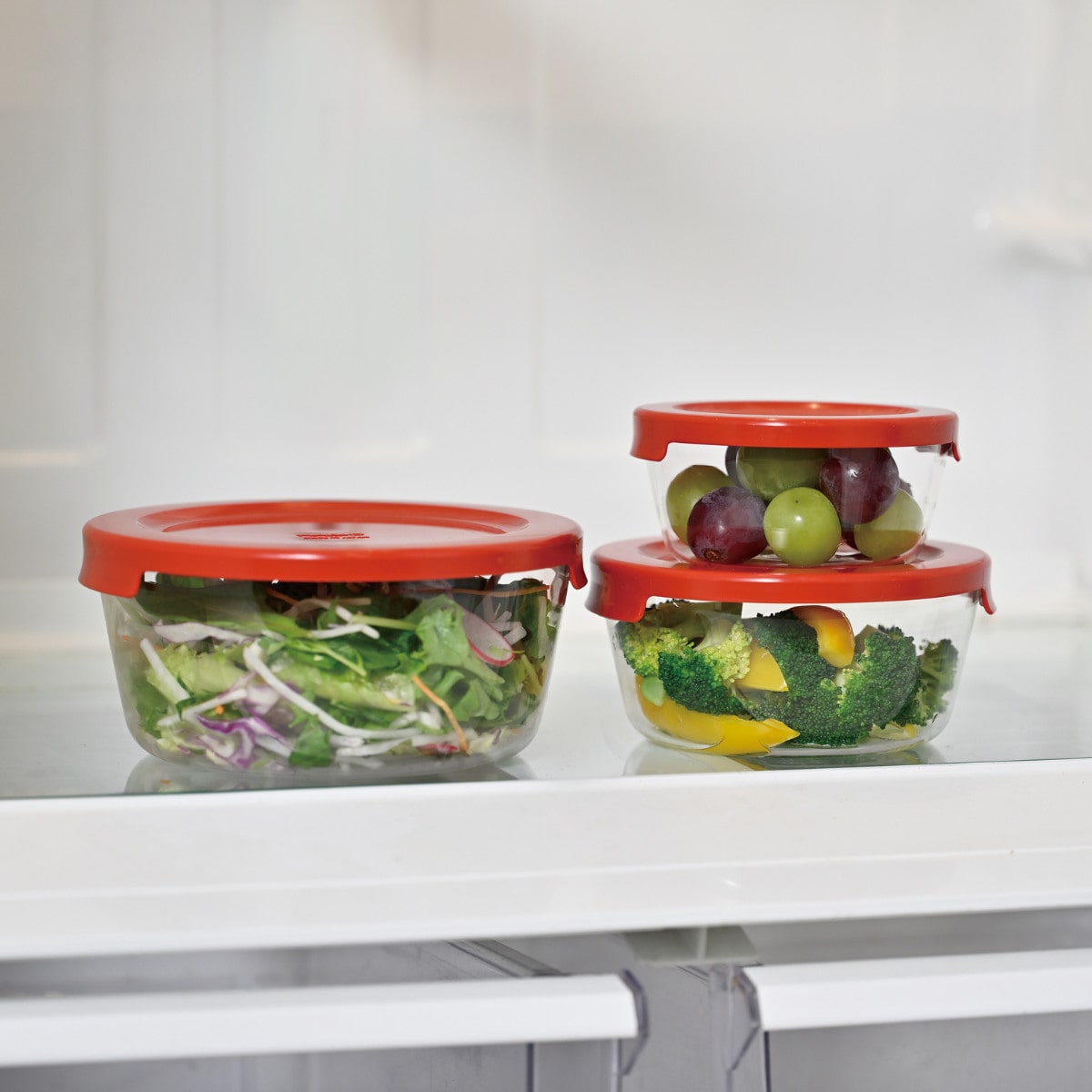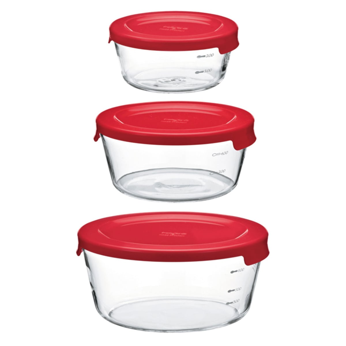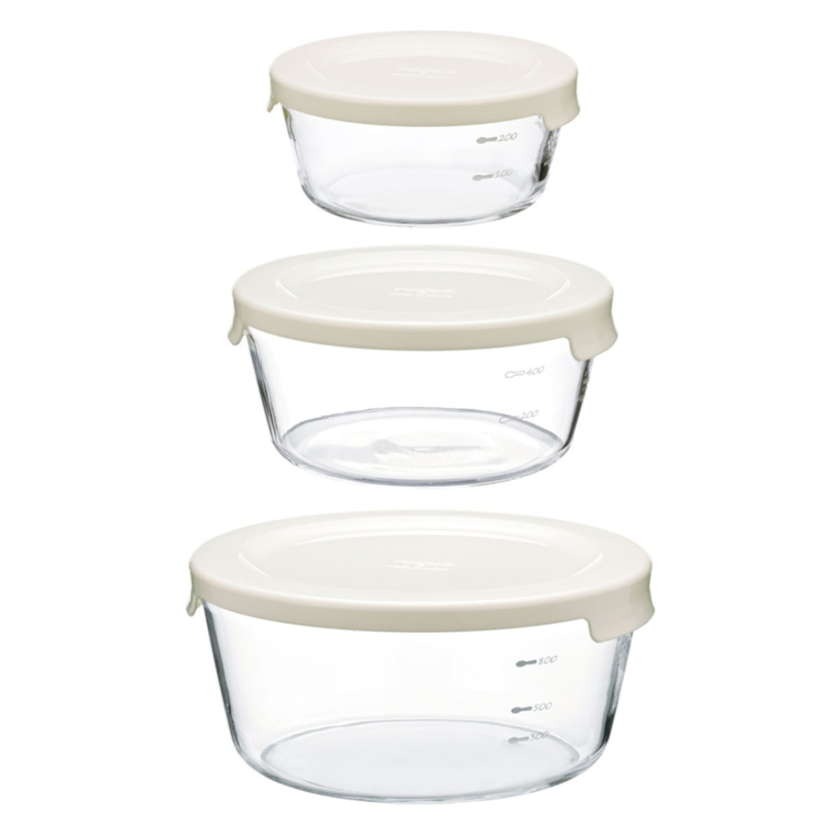 ●色と匂いがつきにくい耐熱ガラス製丸型コンテナ3個入りです。