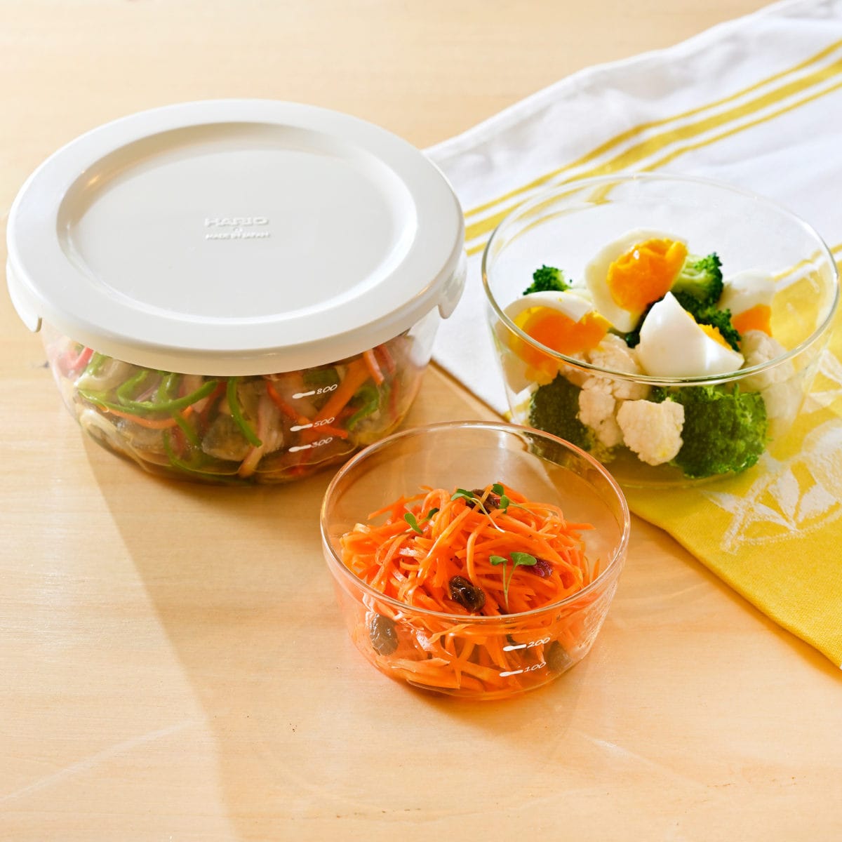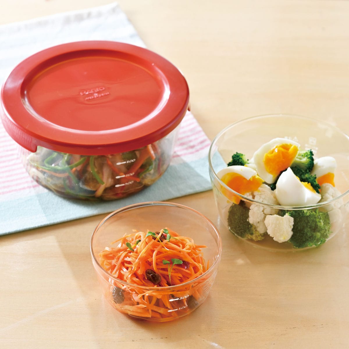 下ごしらえから作り置きおかずの保存など、用途に合わせて選べる丸型保存容器です。色と匂いが付きにくいガラス製の容器なのでいろいろな食材を気にせず保存できます。汚れも落ちやすく、洗い物が楽で気軽に使えます。