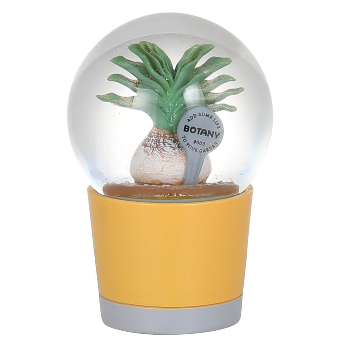 ころんとしたガラスドームの中に、個性的なフォルムが魅力の多肉植物「ブーファン」のオブジェを閉じ込めた、スノードーム風のインテリアオブジェです。まるで小さな植物の世界をそのまま切り取ったようなデザインで、置くだけで空間に遊び心のあるアクセントを添えてくれます。