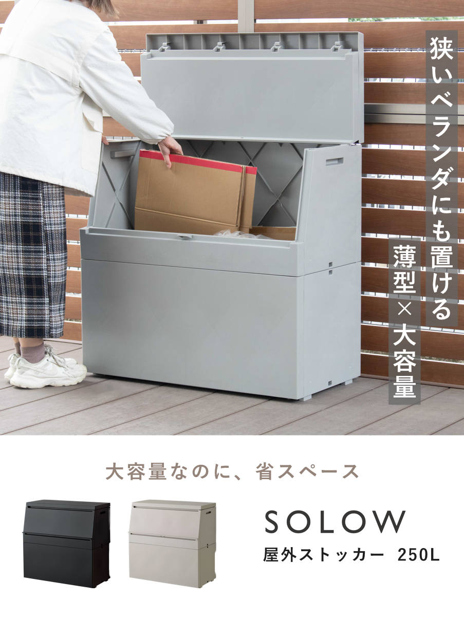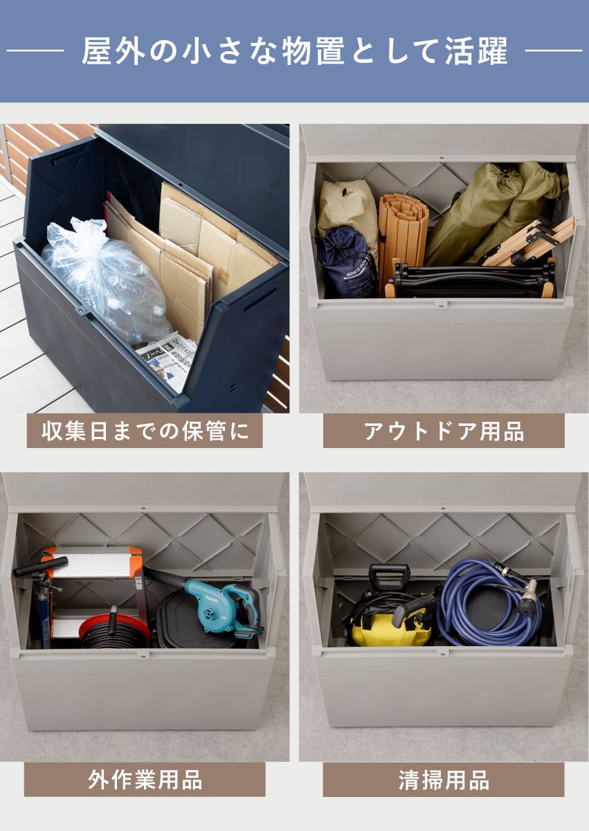 250Lの大容量で、たっぷり収納できます。ゴミの一時保管はもちろん、アウトドア用品の収納にも最適です。細かなアイテムもまとめて収納でき、脚立や自転車の空気入れなどの屋外作業用ツール、清掃用品の収納にも活躍。屋外に置ける小型物置のような感覚で使え、家庭用からアウトドアまで幅広いシーンで頼れる屋外ストッカーです。