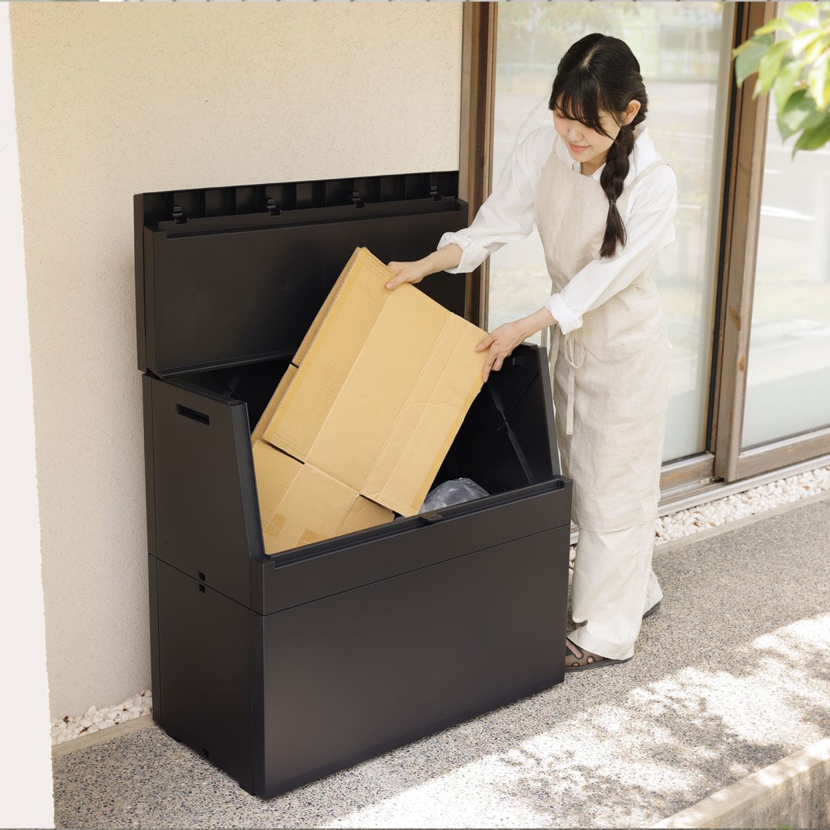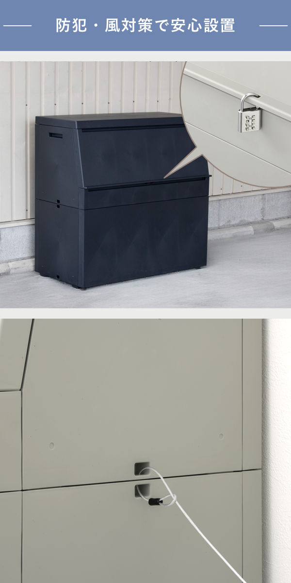 市販の南京錠が使えるフタの鍵穴と、ワイヤーで固定できる両側面のワイヤー穴を備えています。大型の宅配物もしっかり収納できるので、防犯対策や風による転倒防止にも配慮しながら宅配ボックスとして安心してお使いいただけます。
