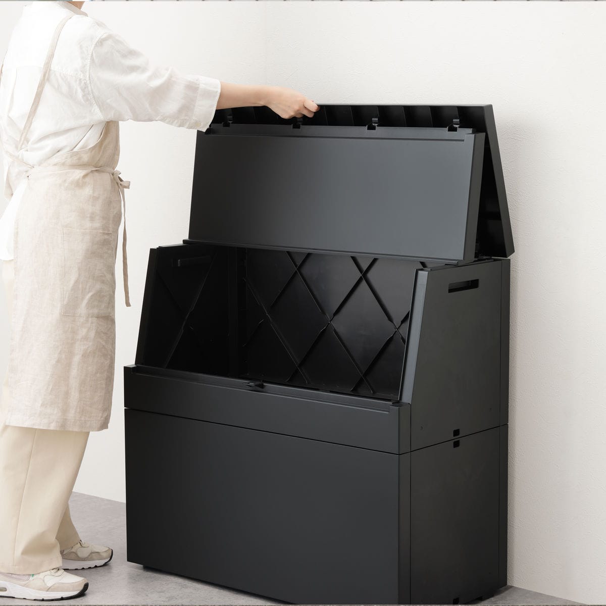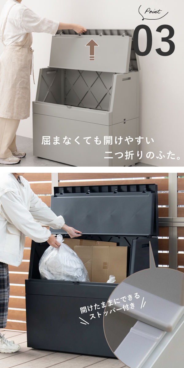 ゴミ袋や段ボールをひとまとめに収納でき、45Lゴミ袋が4~5個しっかり入る250Lの大容量。中身が見えないので生活感を抑え、収集日までスッキリ保管できます。大きく開く開口部でゴミが捨てやすく、毎日のゴミ出しがラクになります。