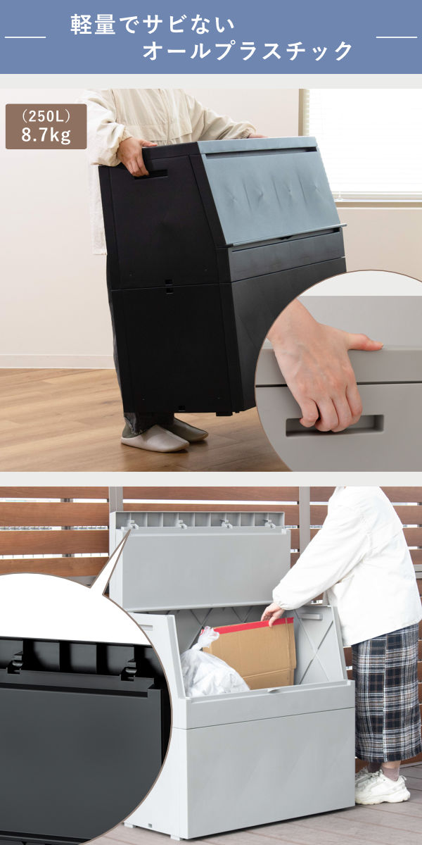 金属パーツを使わないオールプラスチック製のため、屋外に置いてもサビる心配がありません。側面には持ちやすい取っ手を備え、大きさの割に約8.7kgと軽量。両手で安定して持ち運べます。庭やベランダなどさまざまな屋外シーンで、気軽に使える扱いやすいストッカーです。