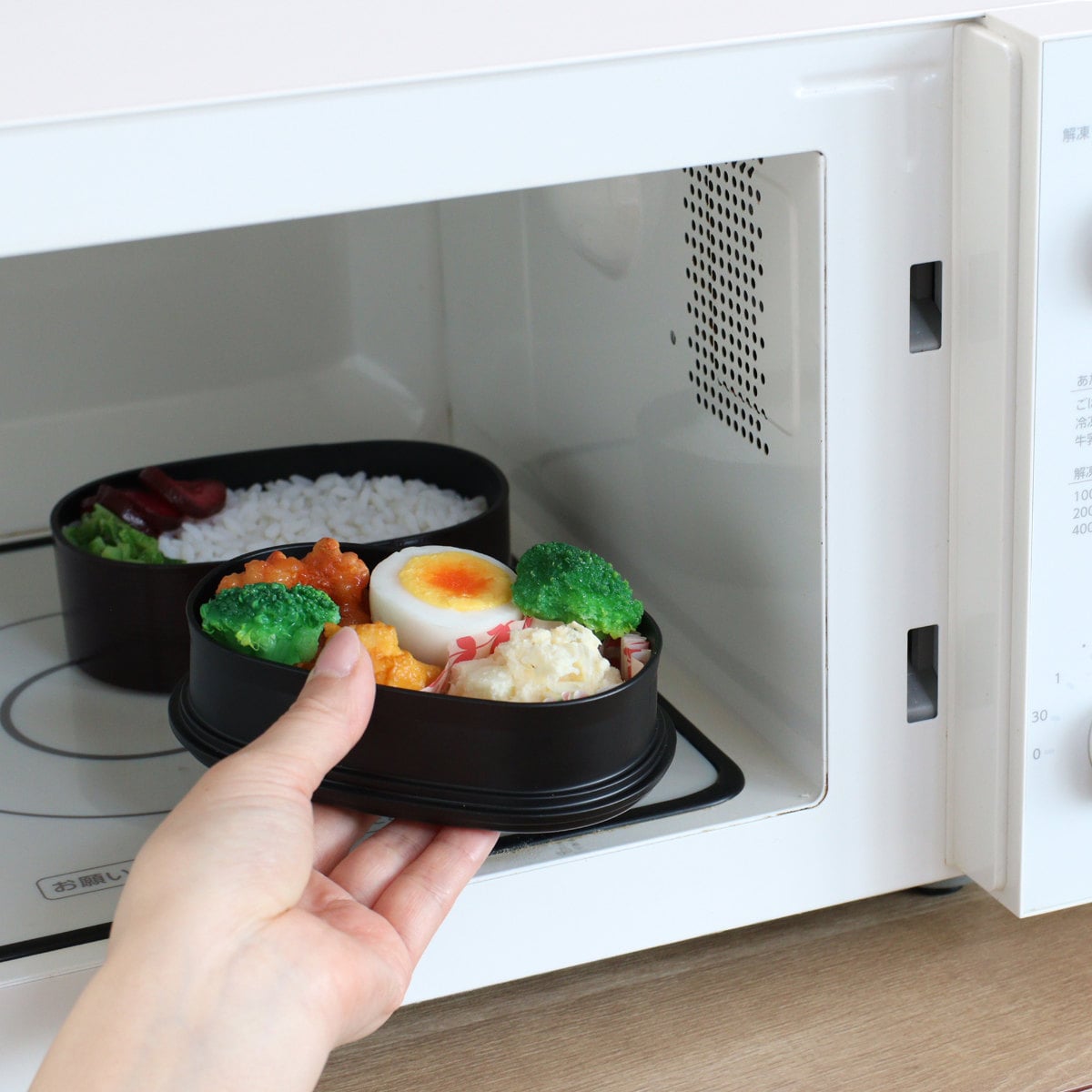 シール蓋を外せば電子レンジで温めることができます。いつでもランチタイムに温かいご飯が食べられます。