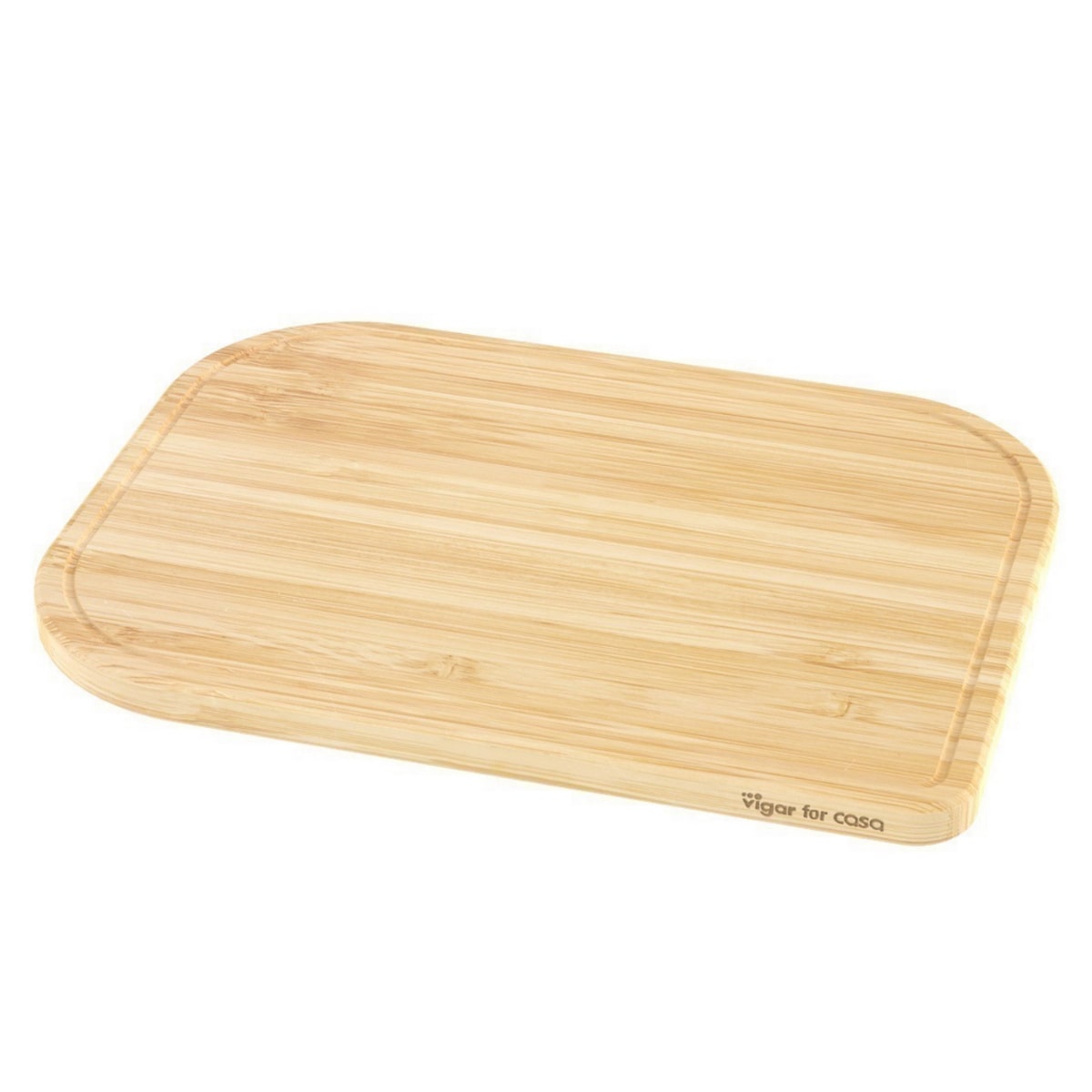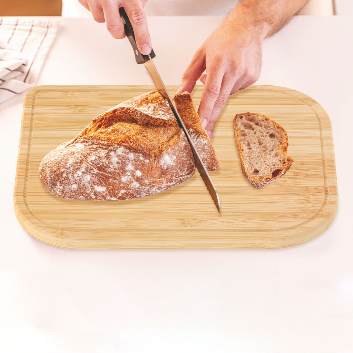 耐久性があり持続可能な素材の竹で作られた、BPAフリーのシンプルなまな板です。周囲に溝があるため、切ったときの汁や水滴が流れにくくキッチンが汚れません。