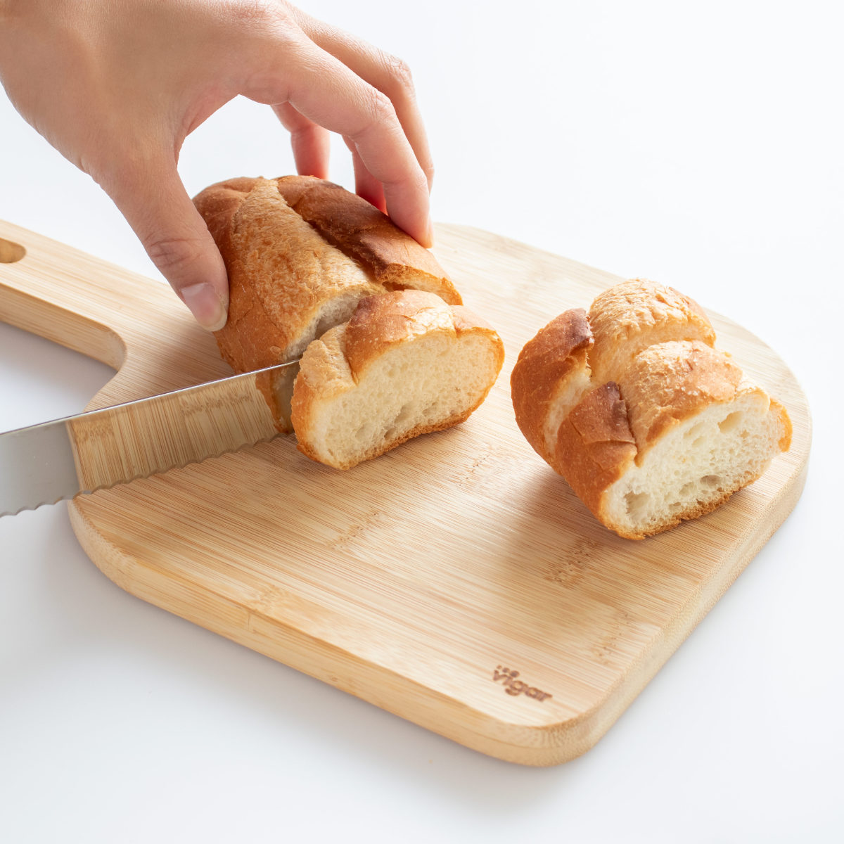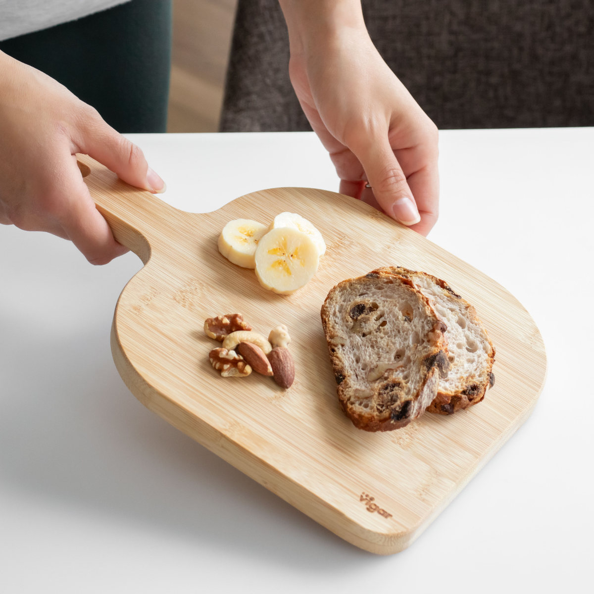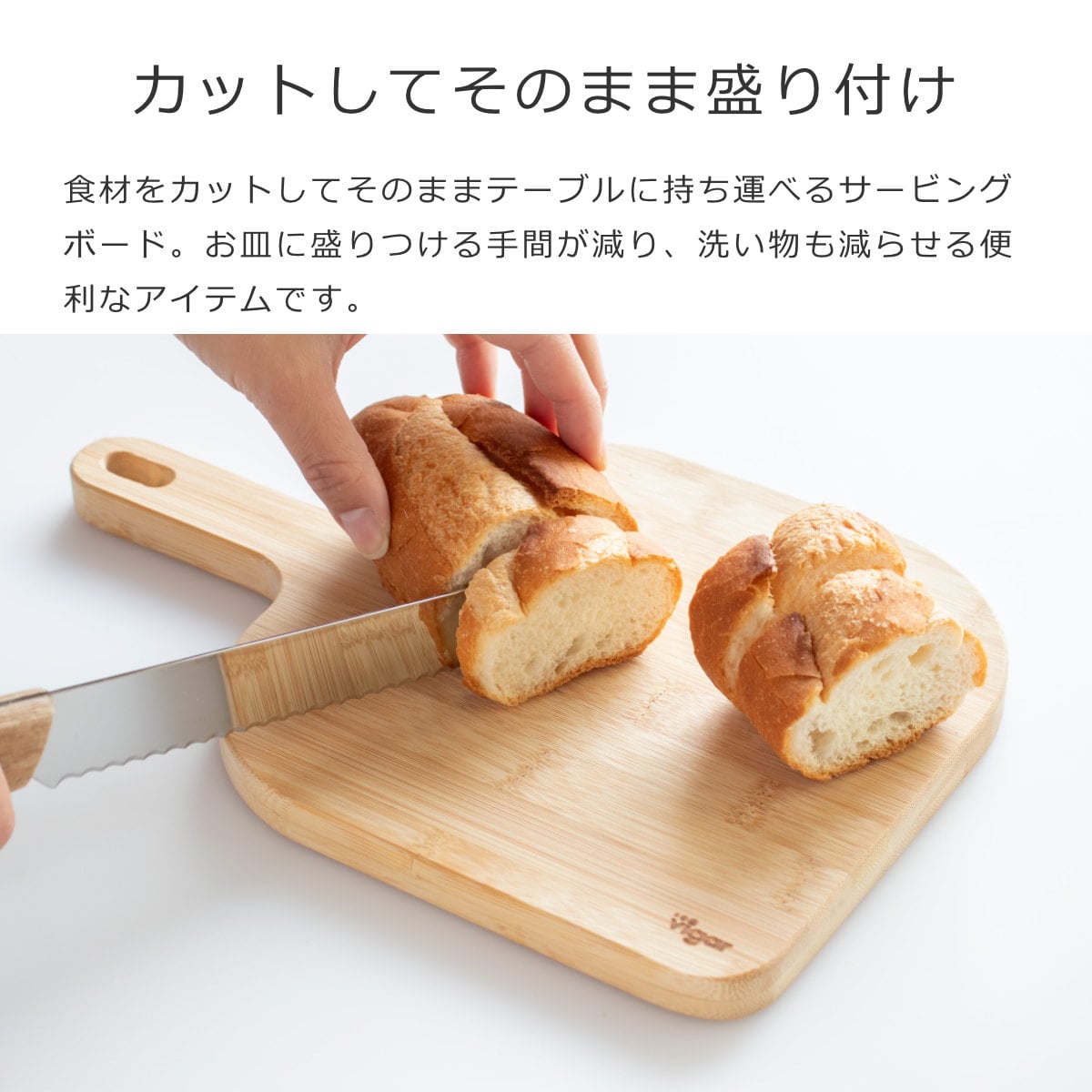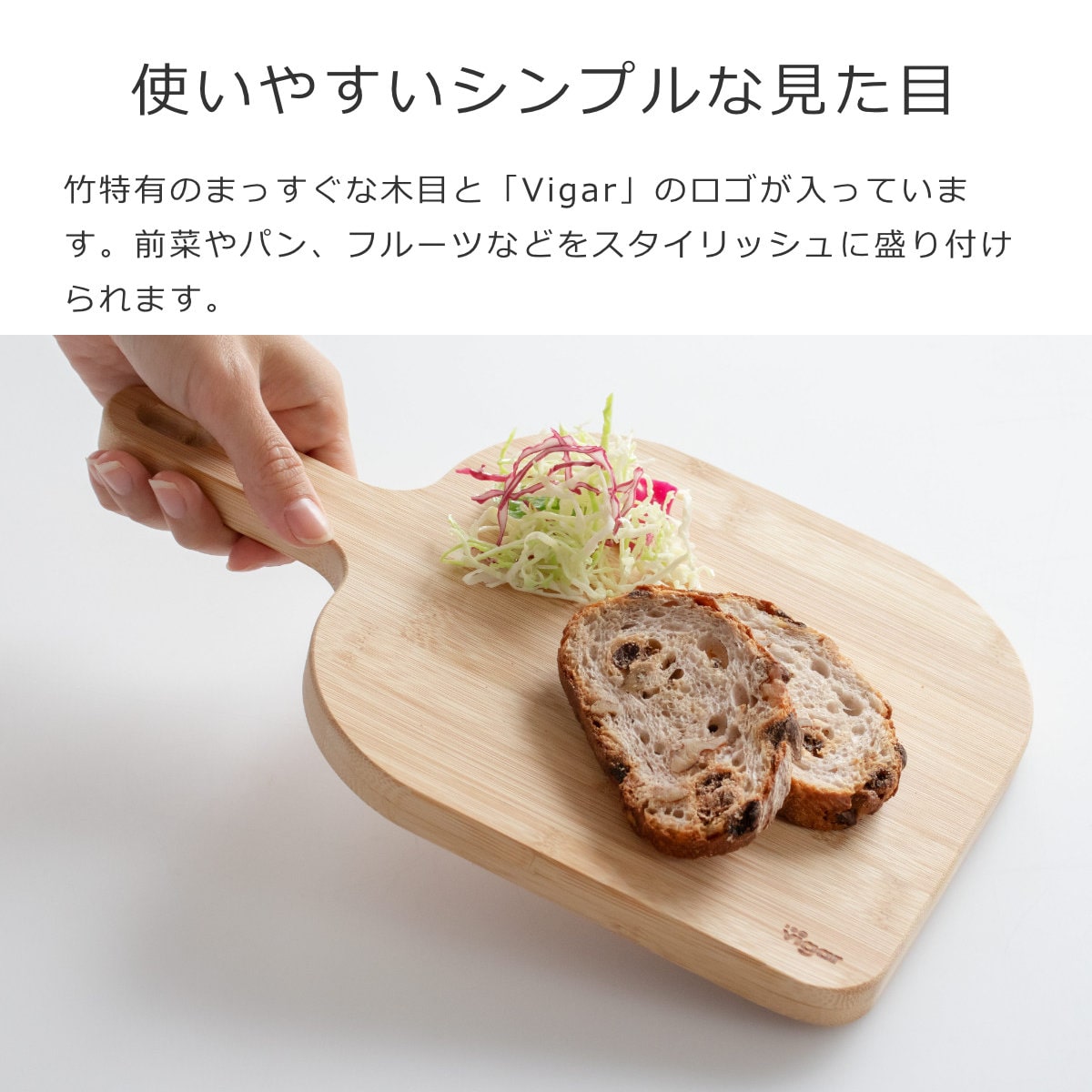 竹特有のまっすぐな木目と「Vigar」のロゴが入っています。前菜やパン、フルーツなどをスタイリッシュに盛り付けられます。