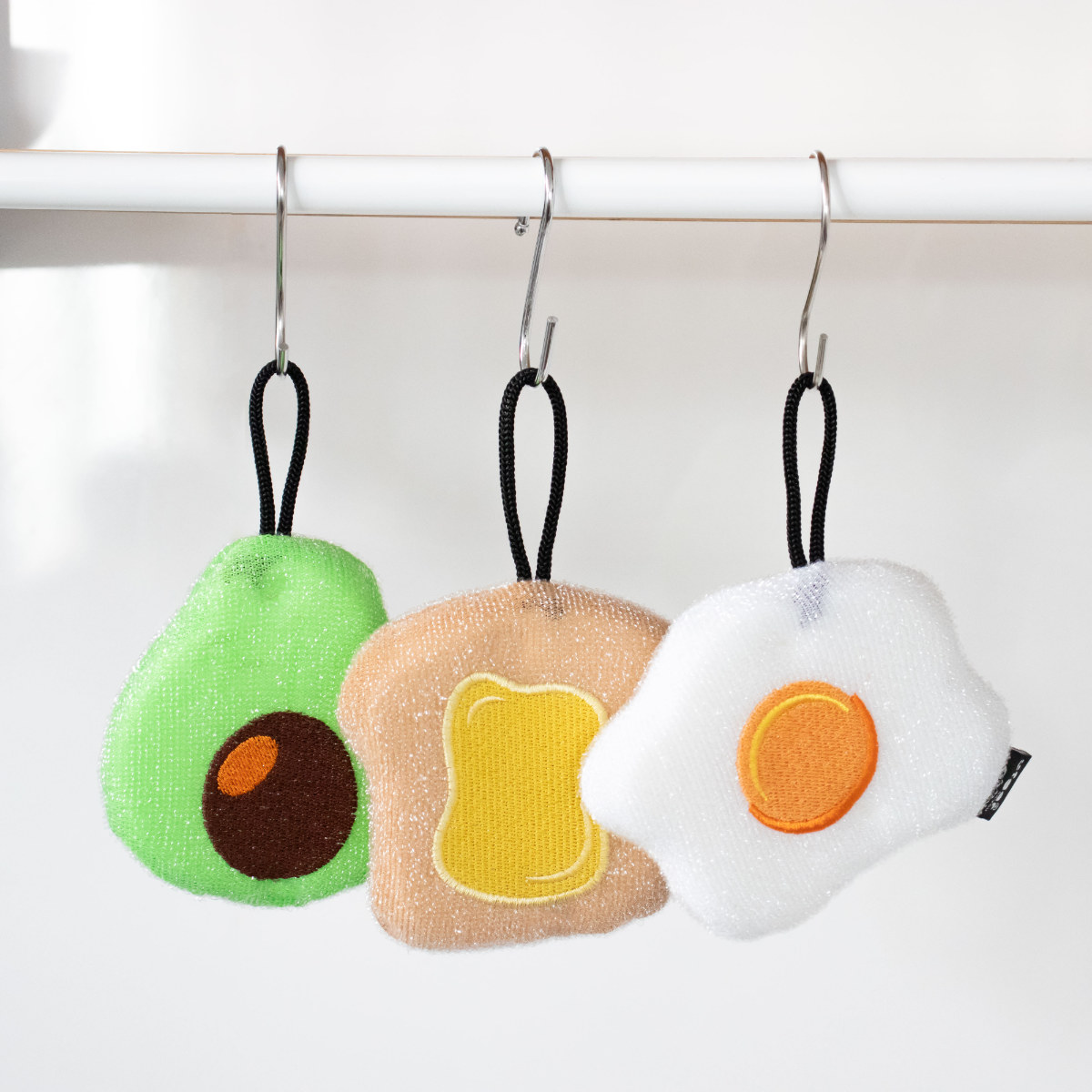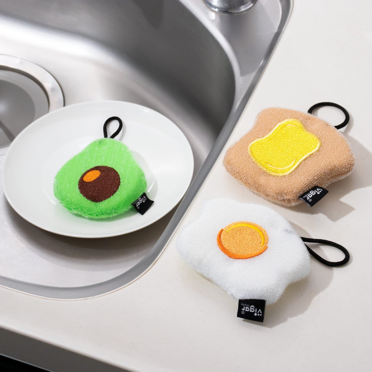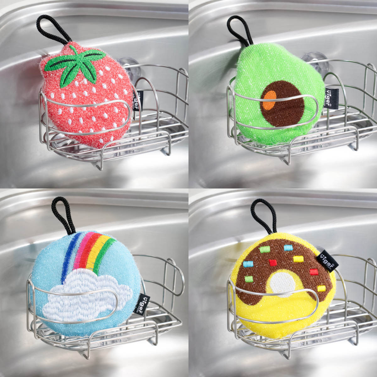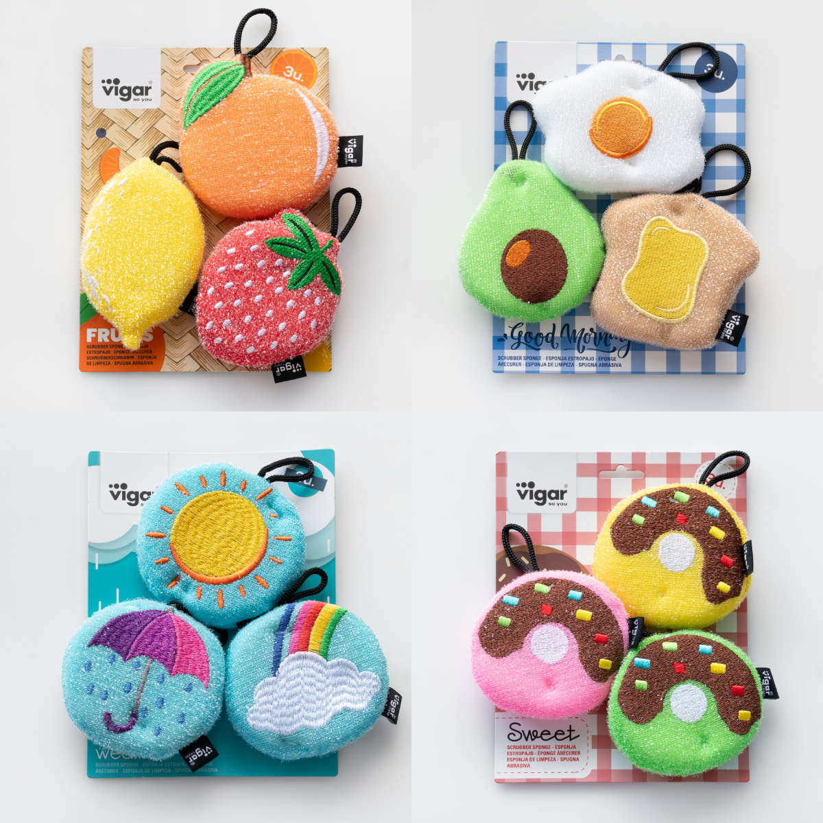 フルーツ・朝食・天気・ドーナツと遊び心あふれたユニークなキッチンスポンジ3個セットです。3個それぞれ形や色が違い、カラフルで可愛く、面倒な食器洗いも少し楽しい気分に。