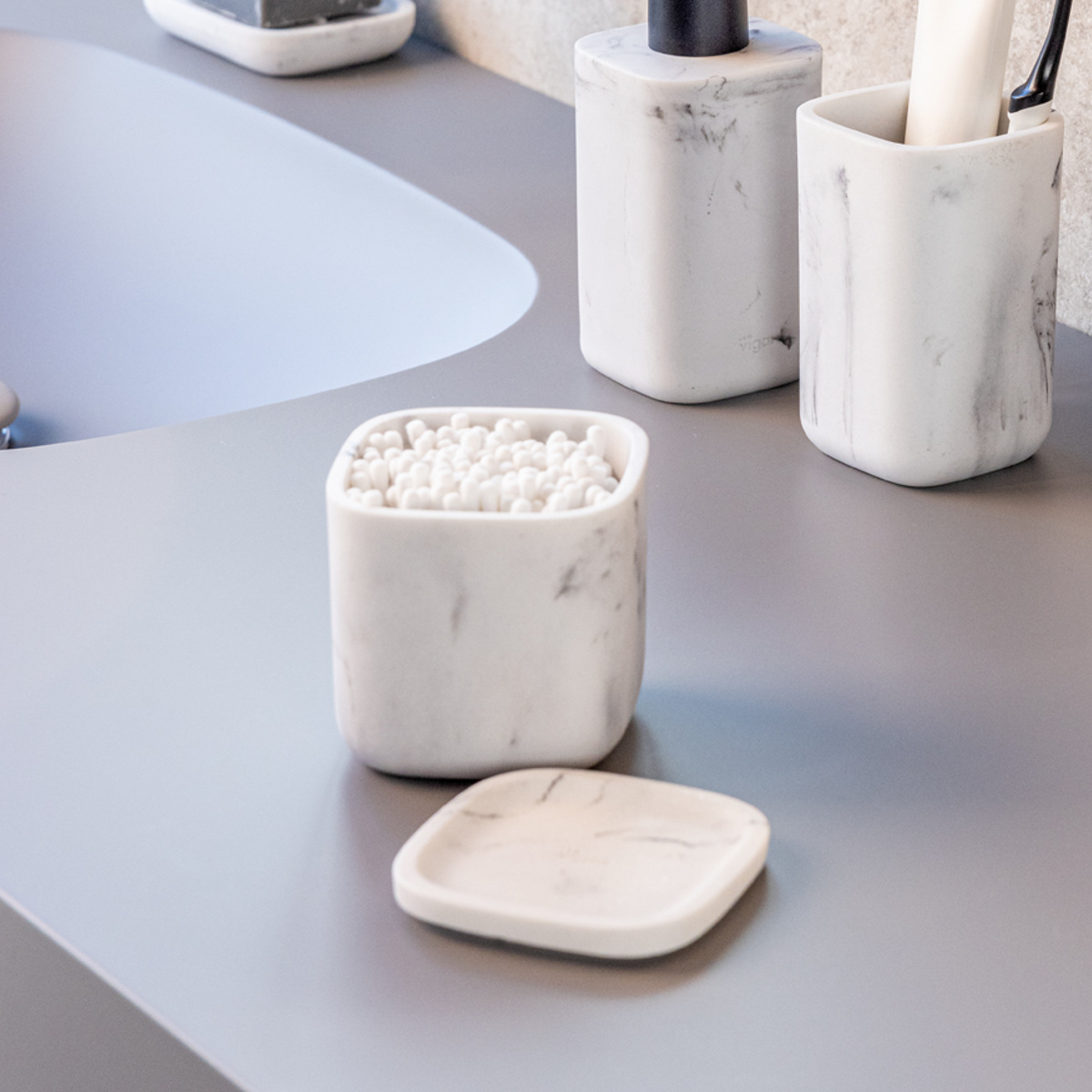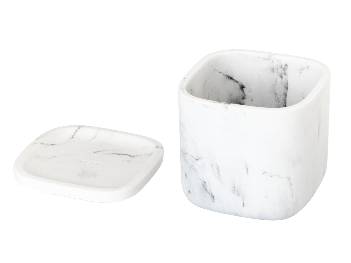 本物の大理石のように落ち着いた、マットな質感の四角形の小物ケースです。洗面スペースで使う綿棒やコットンなどの小物を、生活感を出さずにすっきりと収納できます。重厚感のある佇まいで、ワンランク上の空間に仕上げます。