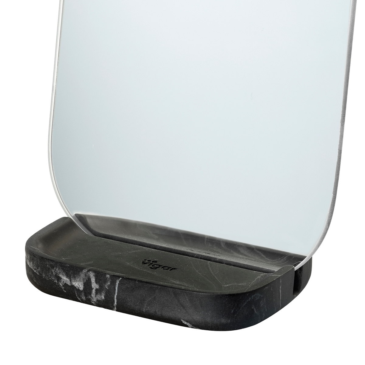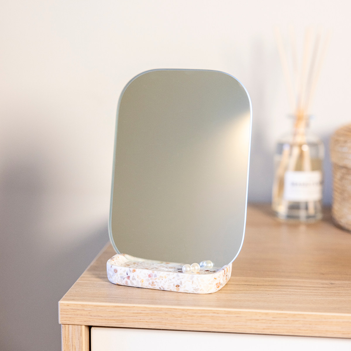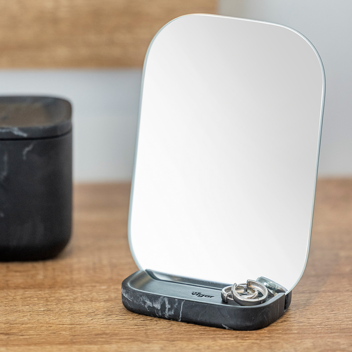 洗練されたデザインと実用性を兼ね備えた卓上ミラーです。メイクで使いやすいコンパクトなサイズで、長方形のミラーが顔全体を映します。ミラーは取り外し可能で、近くで見たい時は手鏡のように手に持って使えます。