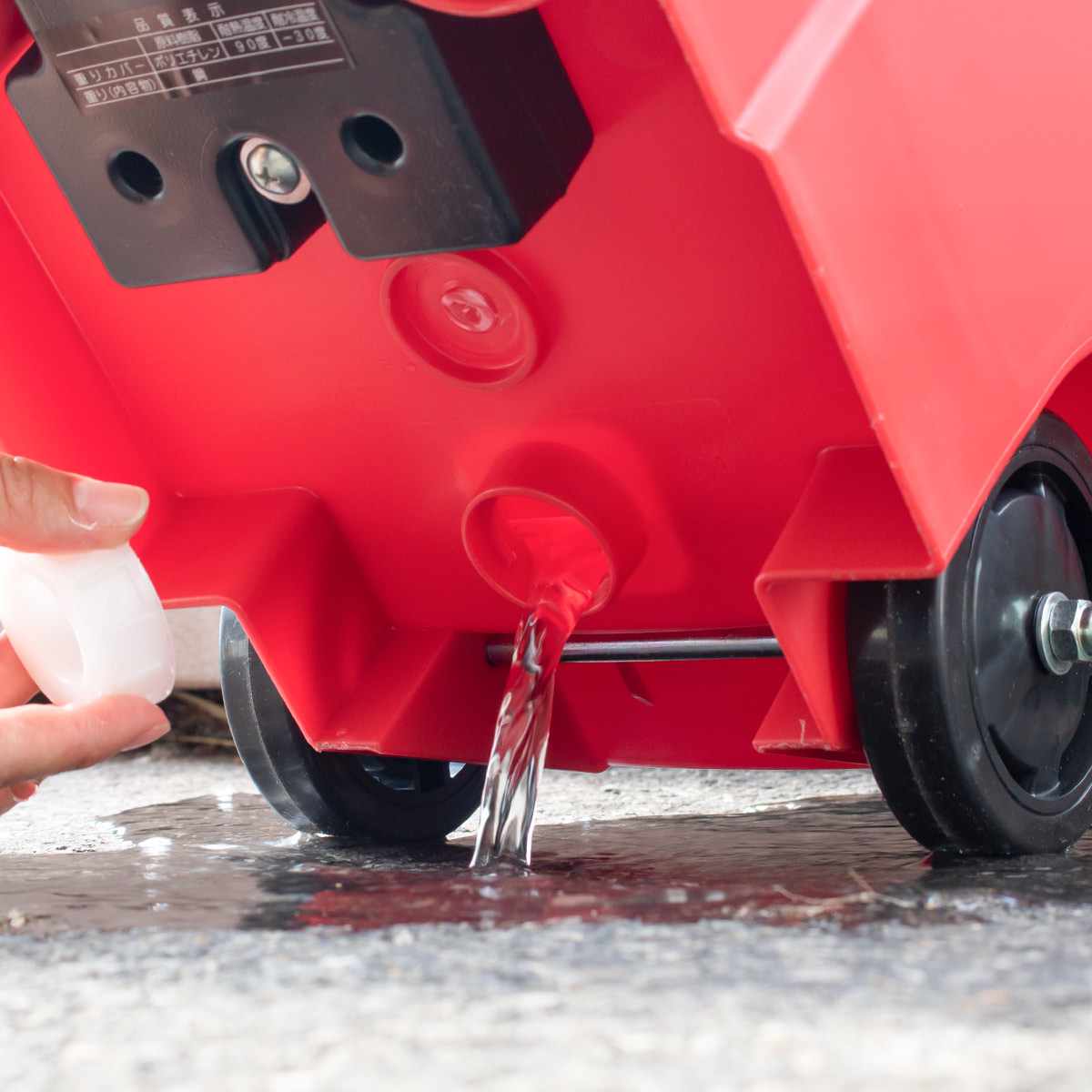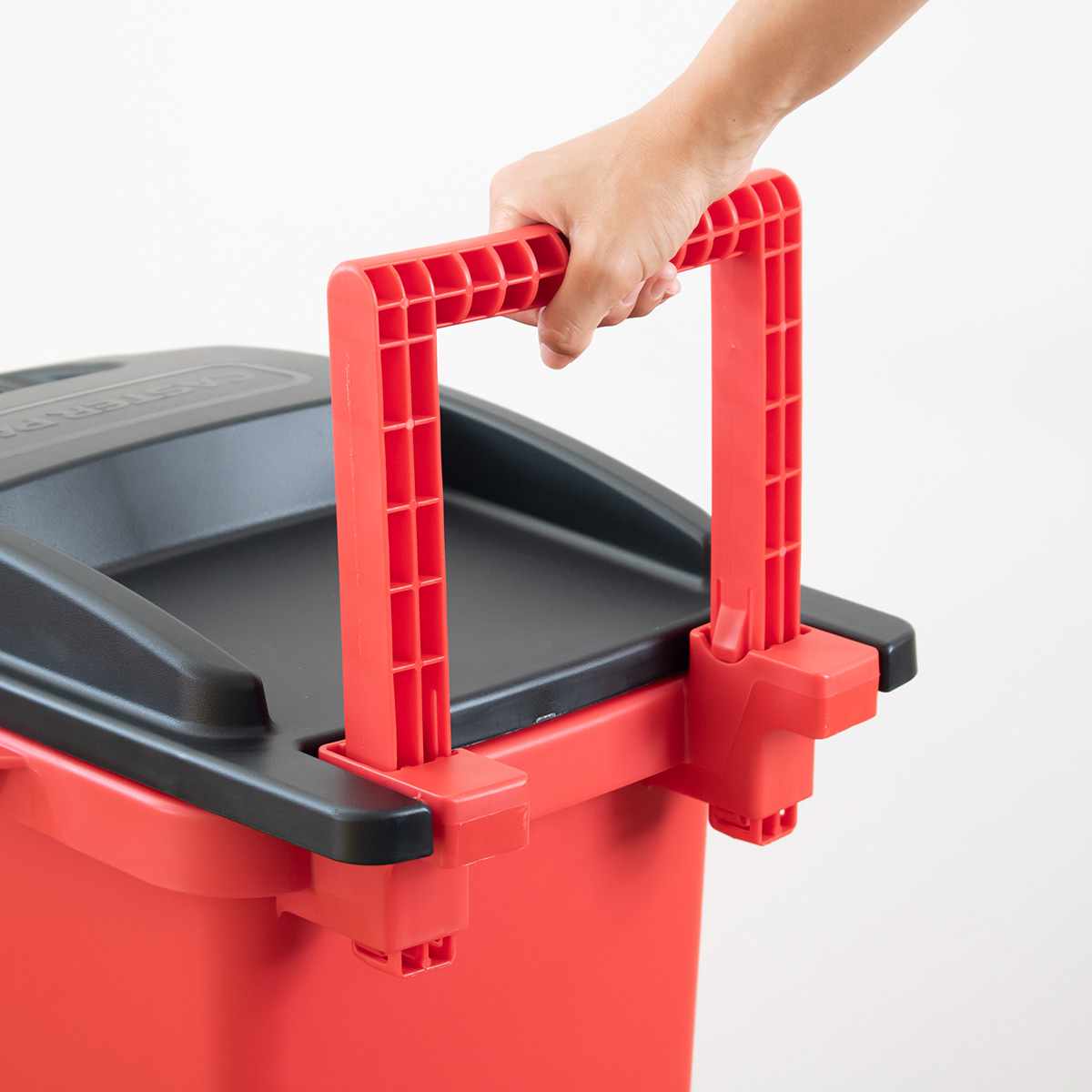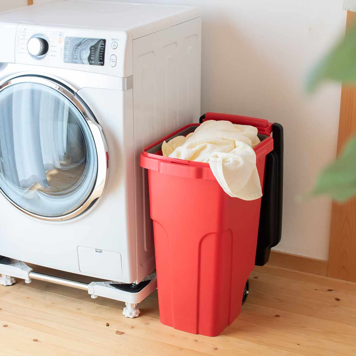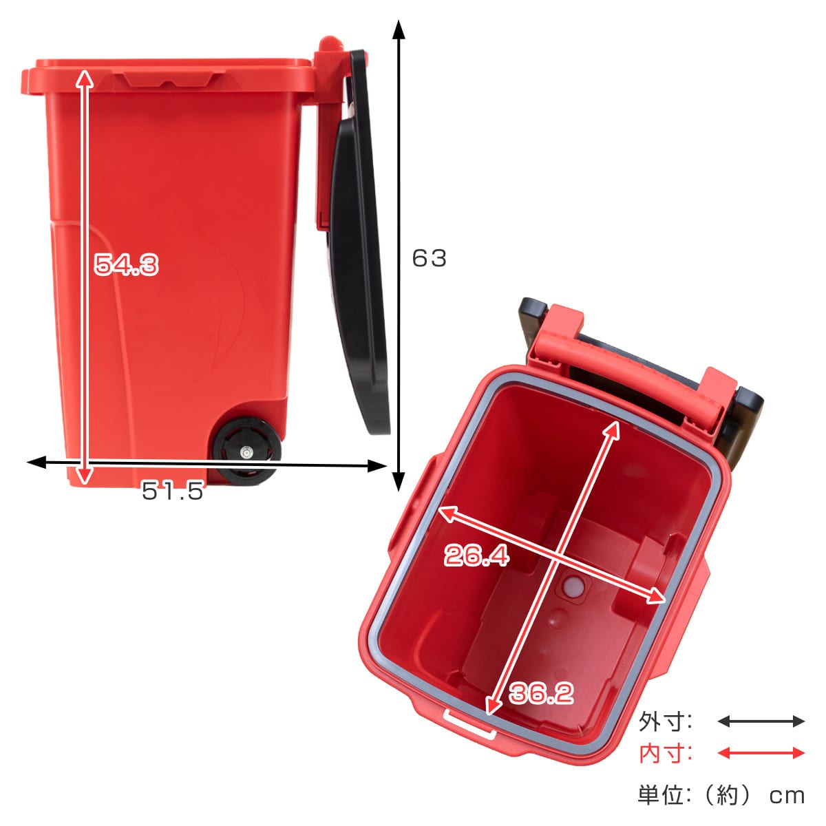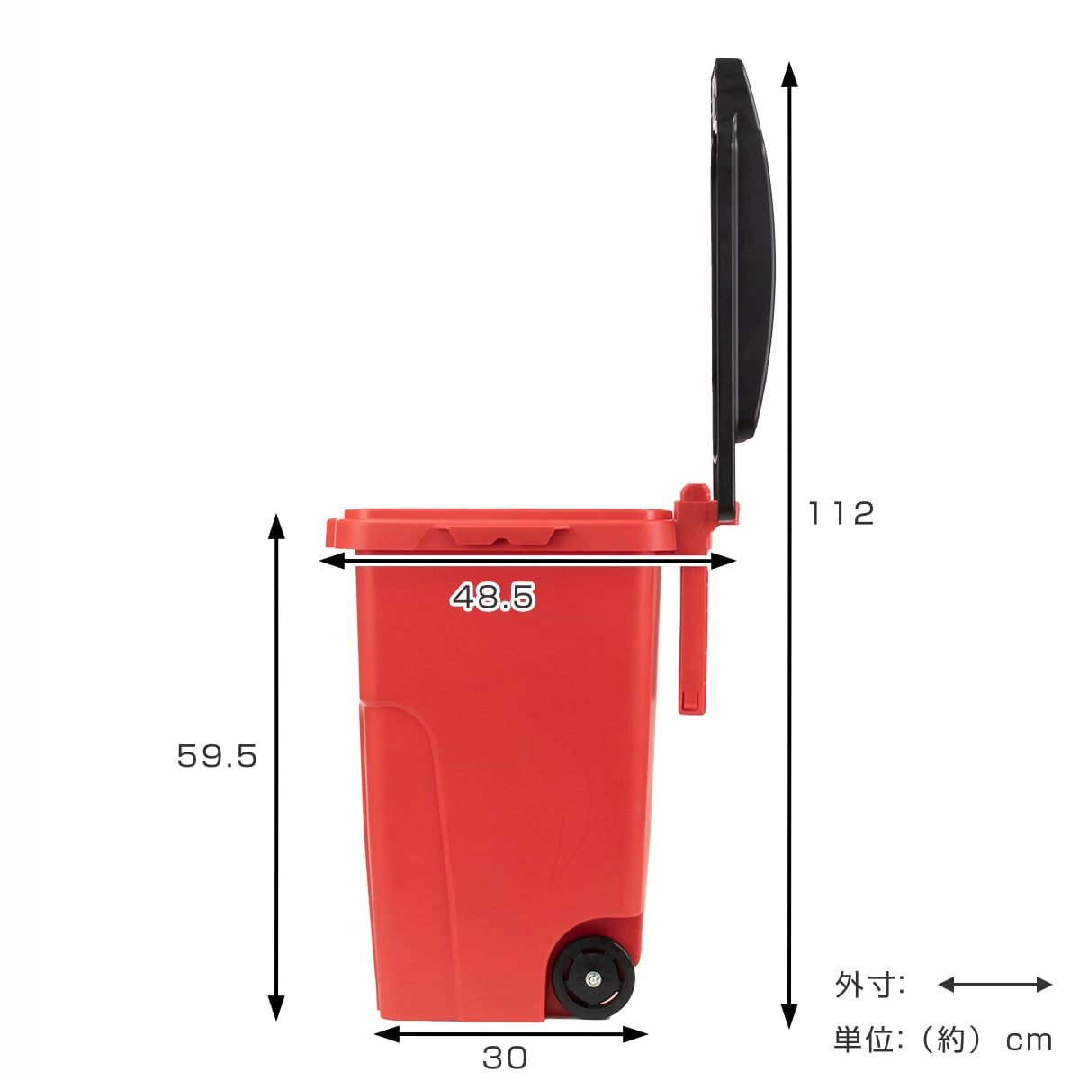 | 材質 | 本体・ふた・ふたロック・ポリ袋止め・ホイール・ハンドル:ポリプロピレン 排水栓・重りカバー:ポリエチレン ふたパッキン:発泡ポリエチレン 車輪軸・ストッパー・ネジ・ワッシャー・重り:鋼(スチール) タイヤ:エラストマー 前輪キャスター:ナイロン |