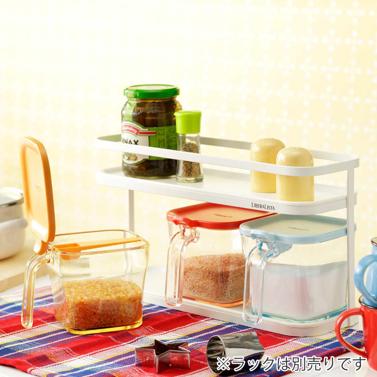 4色展開なので、同じ色でまとめたり、調味料に合わせて色を変えたり、お好みで組み合わせることができます。また、別売りのラックと合わせて使えば、スッキリ収まり、ゴチャつきがちな調味料もスッキリ整います。