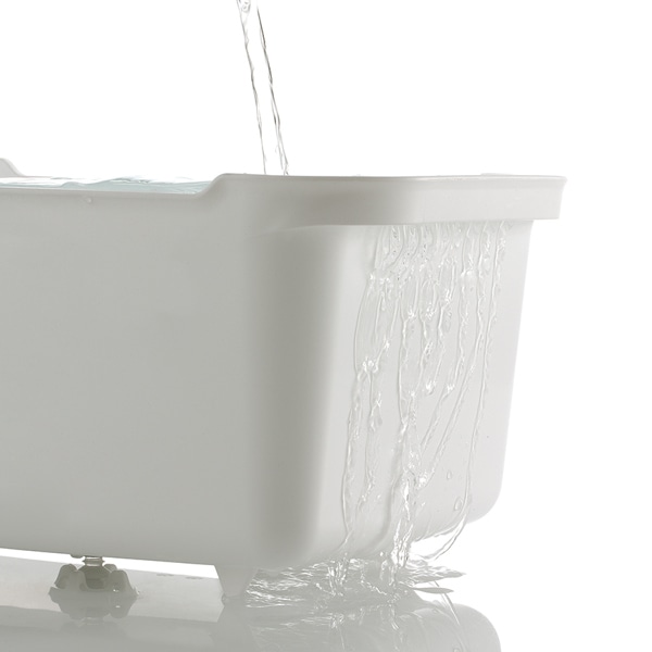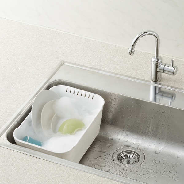 取っ手に備えたオーバーフロー防止機能により、水の溢れを抑え、箸などの食器が流れ出るのを防ぎます。食器の浸け置きや野菜洗いに適した、十分な深さも備えています。