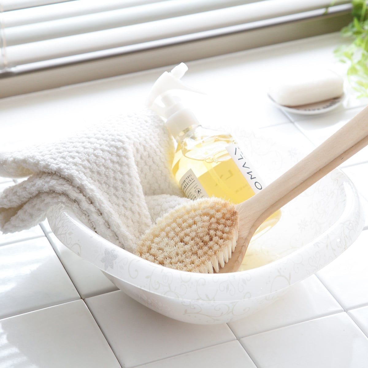 フチが反り返っているため指を引っ掛けて持ちやすく、お湯汲みがしやすくなっています。容量2.6Lでかけ湯にも最適です。