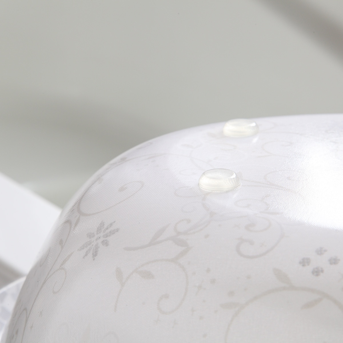 オフホワイトは華やかながらも儚い印象の「白雪姫」、コーラルピンクは可憐で愛おしい「親指姫」、ペールブルーは美しく煌めく「シンデレラ」、柄のテイストの異なる3カラー展開です。柄の中にはそれぞれの物語を象徴するモチーフが隠されています。