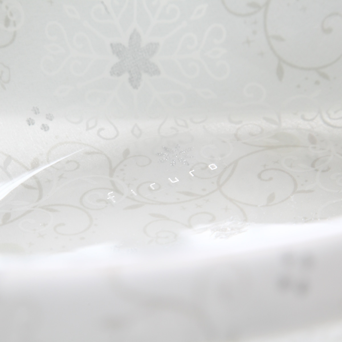 特殊加工により、柄の入った生地がアクリル板の中に積層されています。細かな生地感が繊細に表現され、ラメのアクセントが加わり、まるで浮かびあがるような美しいデザインです。