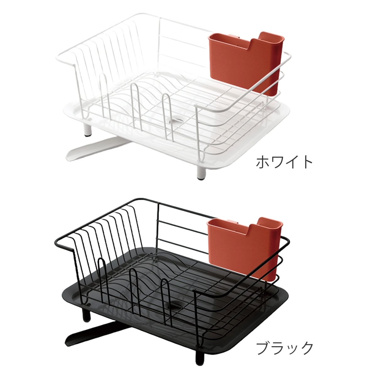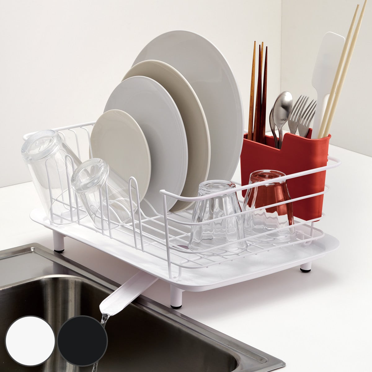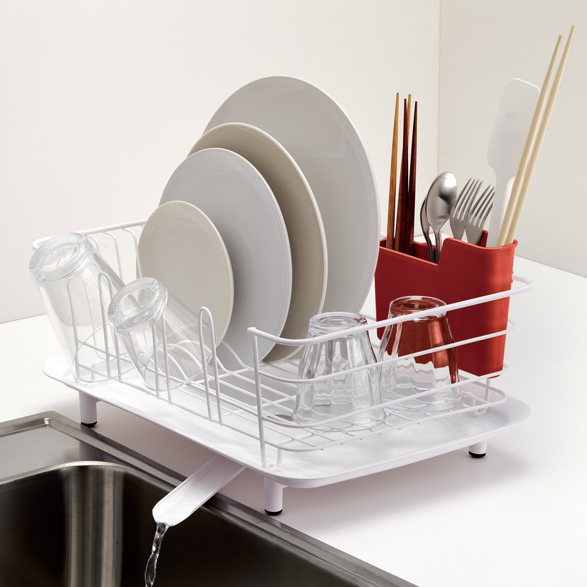 菜箸などの柄の長いツールも、スプーンなどの短いカトラリーも、立てやすく取りやすい2段階設計になっています。ラックの内側にも外側にも設置可能で、底には水切りの穴が開いています。