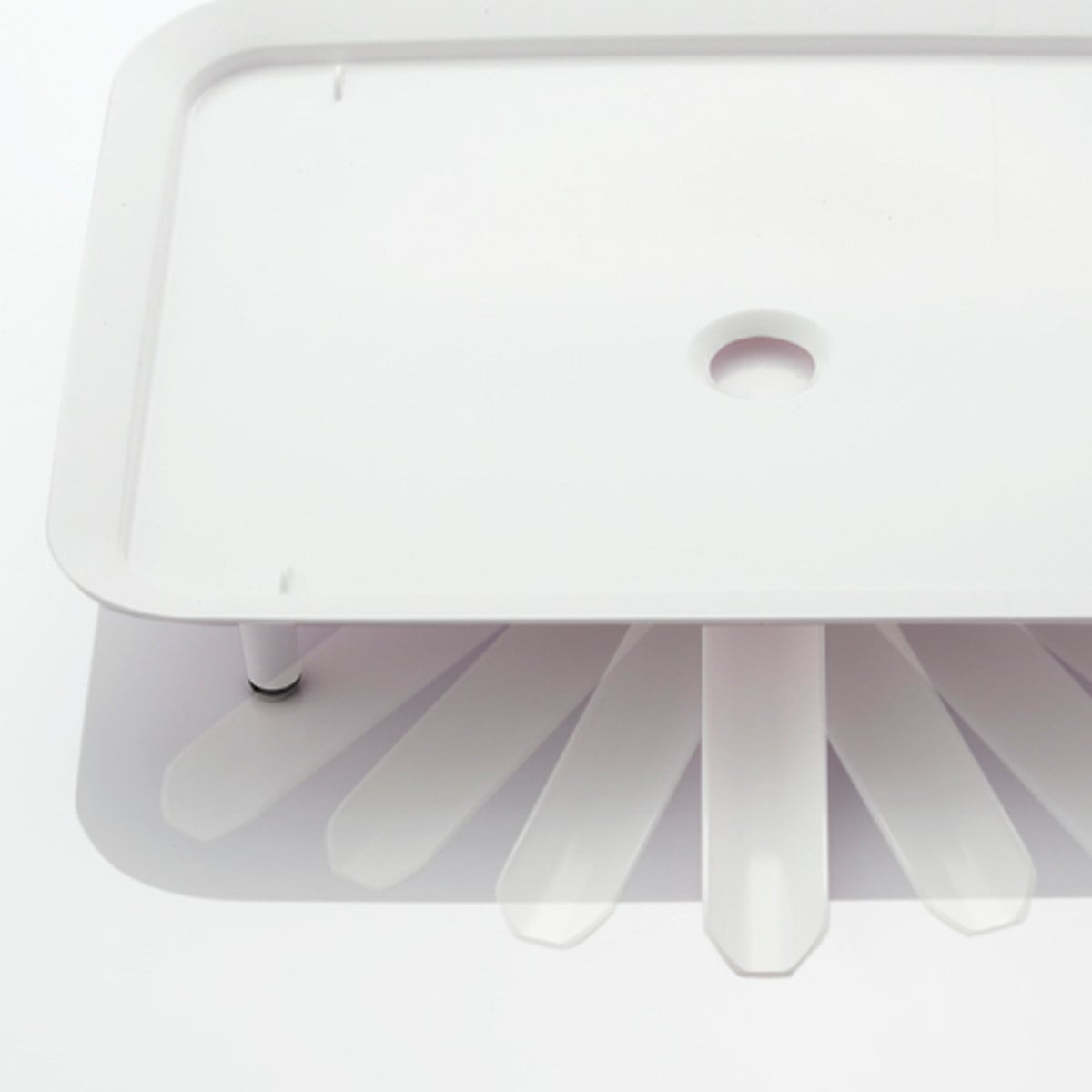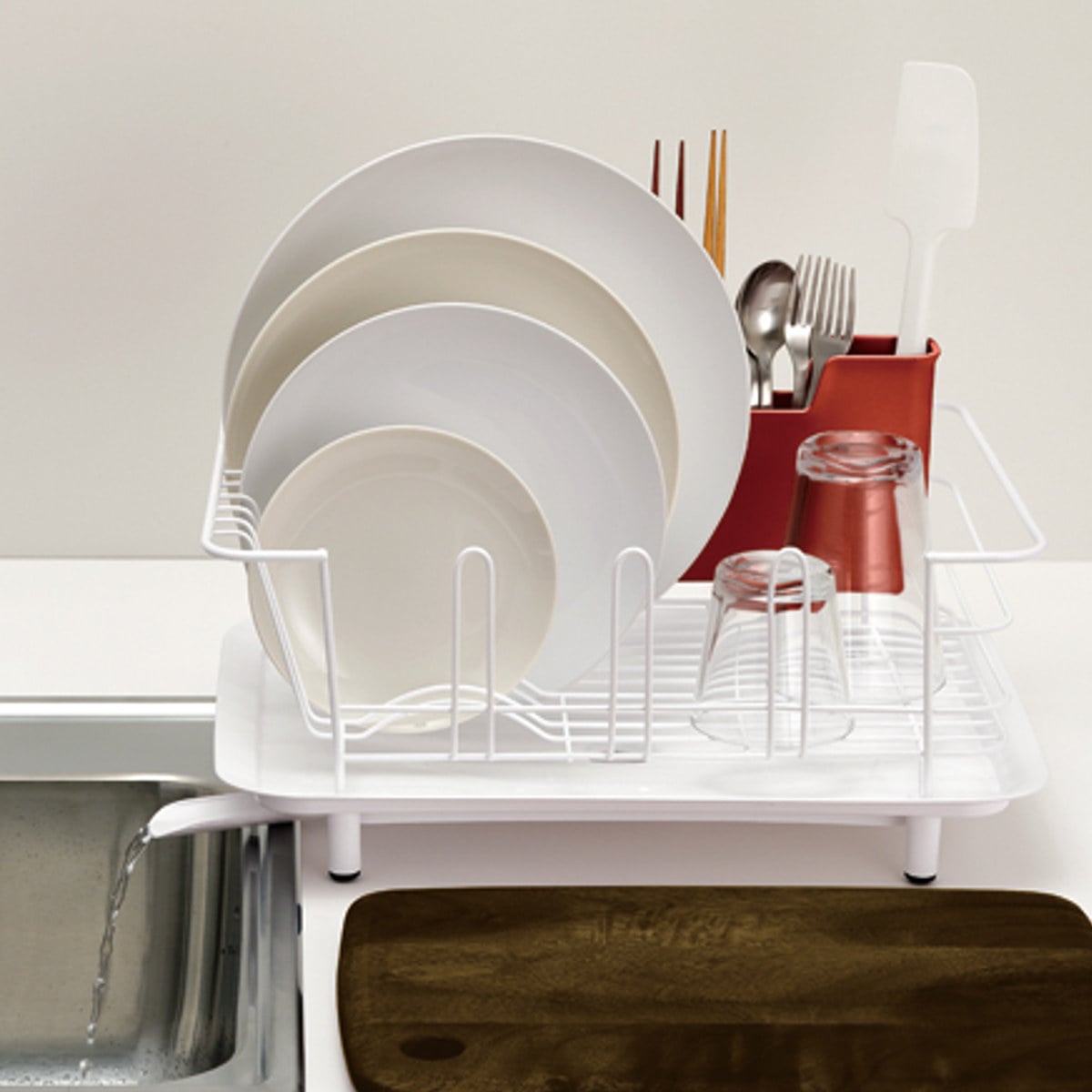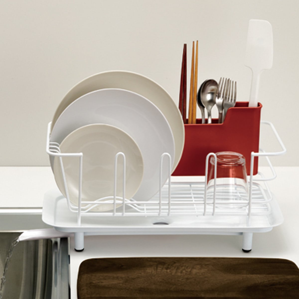 菜箸などの柄の長いツールも、スプーンなどの短いカトラリーも、立てやすく取りやすい2段階設計になっています。ラックの内側にも外側にも設置可能で、底には水切りの穴が開いています。