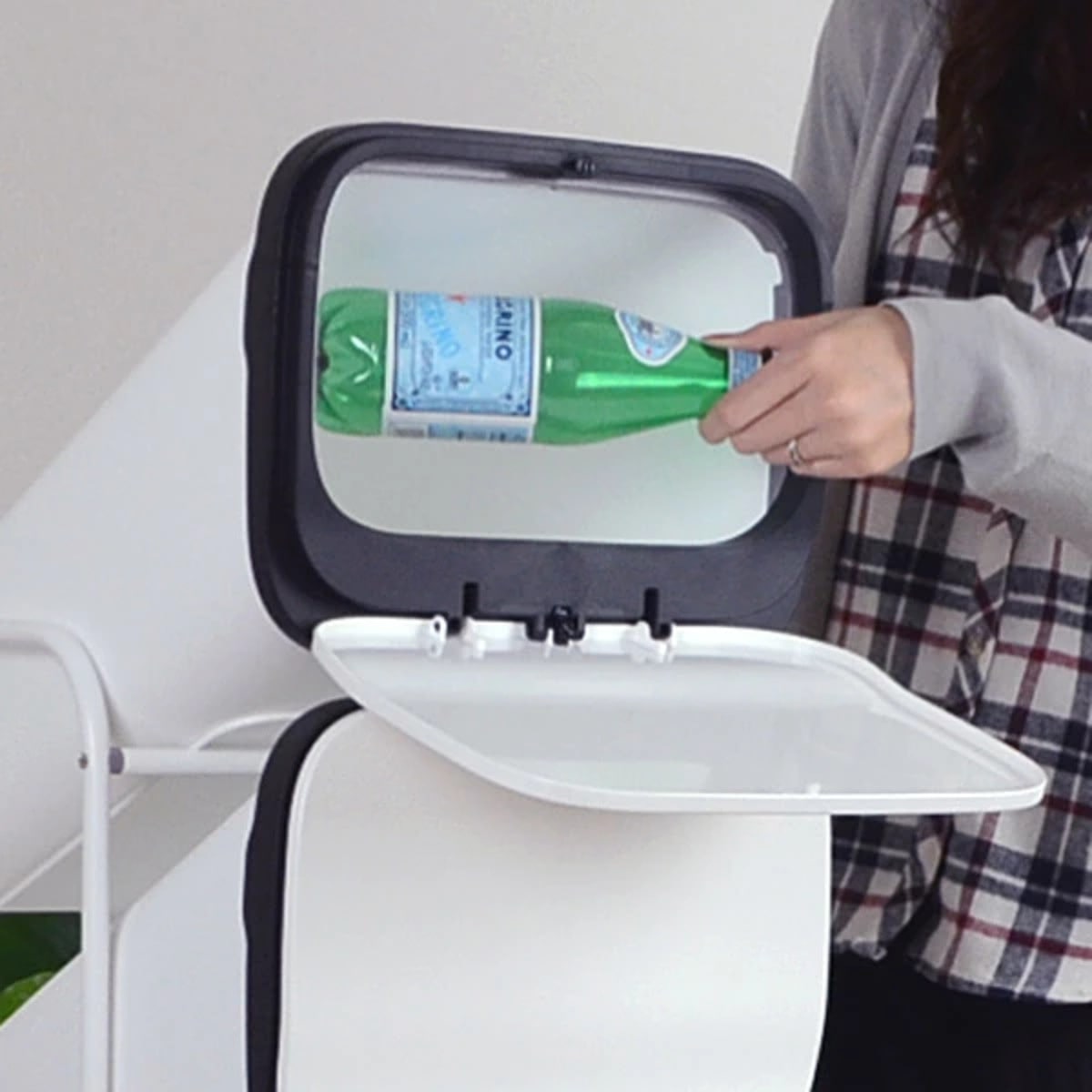それぞれのゴミ箱は上向きに設置されているため、中身がこぼれにくくなっています。ふたは下向きに開くので、手放しでも使用できます。
